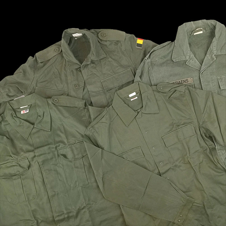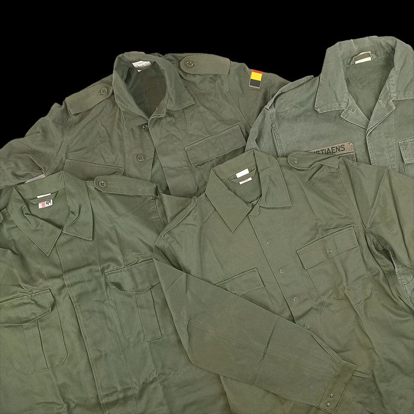 A Belgian lucky dip! These are a mix of shirts of different models spanning many years but they have these things in common: They're Belgian, olive drab and they have long sleeves.