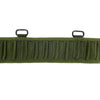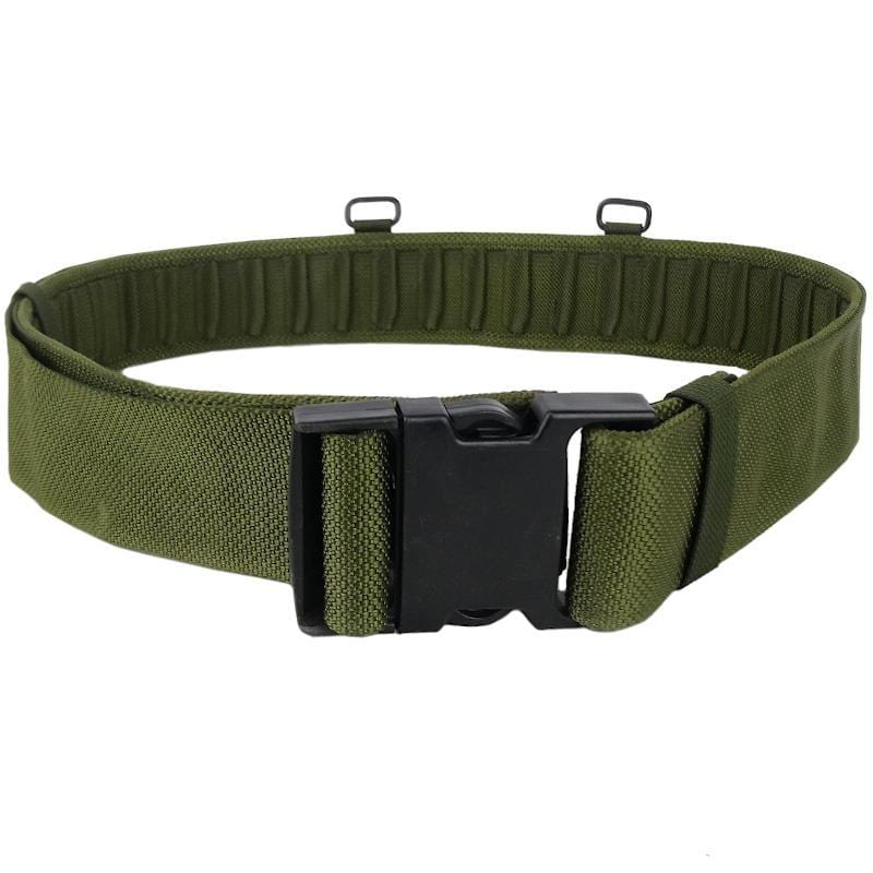 This is a British Army issue belt made from a heavy-duty webbing. To fasten things up, it has an oversized quick-release buckle and two metal d-rings for yoke attachment at the back.