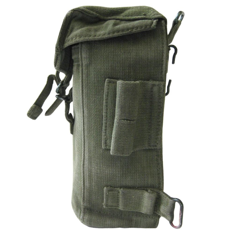 Here we have a genuine issue British army magazine pouch, part of the 58 pattern webbing system. This pouch is the perfect size for a variety of magazines and general storage. Unlike the RH pouch, this one has a pocket for carrying the users bayonet.