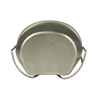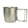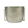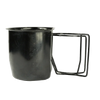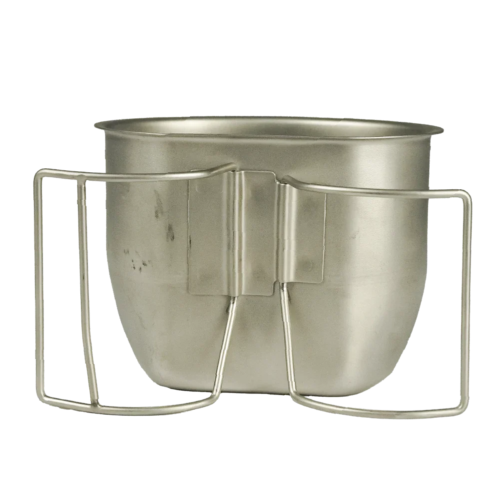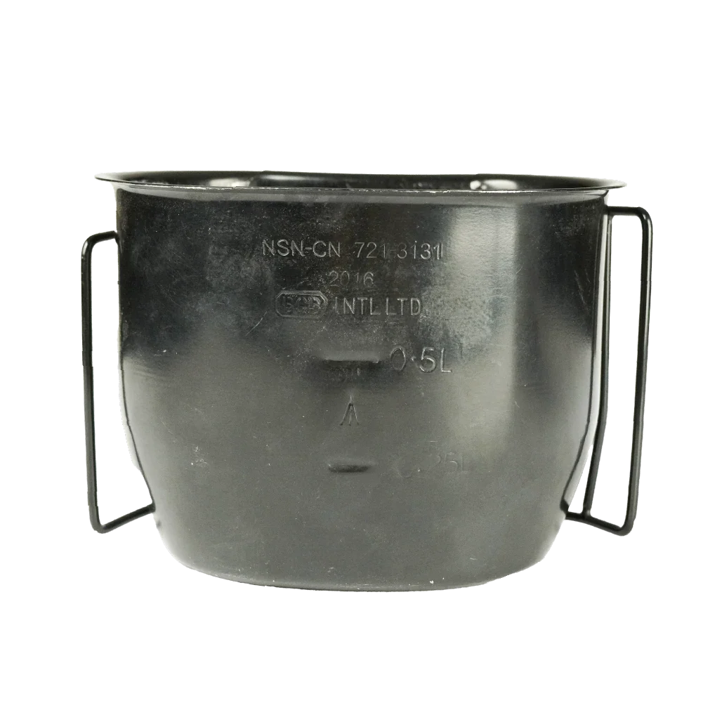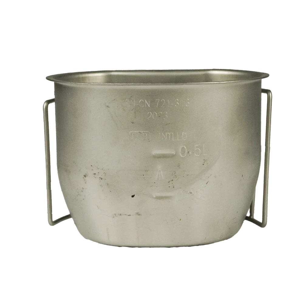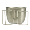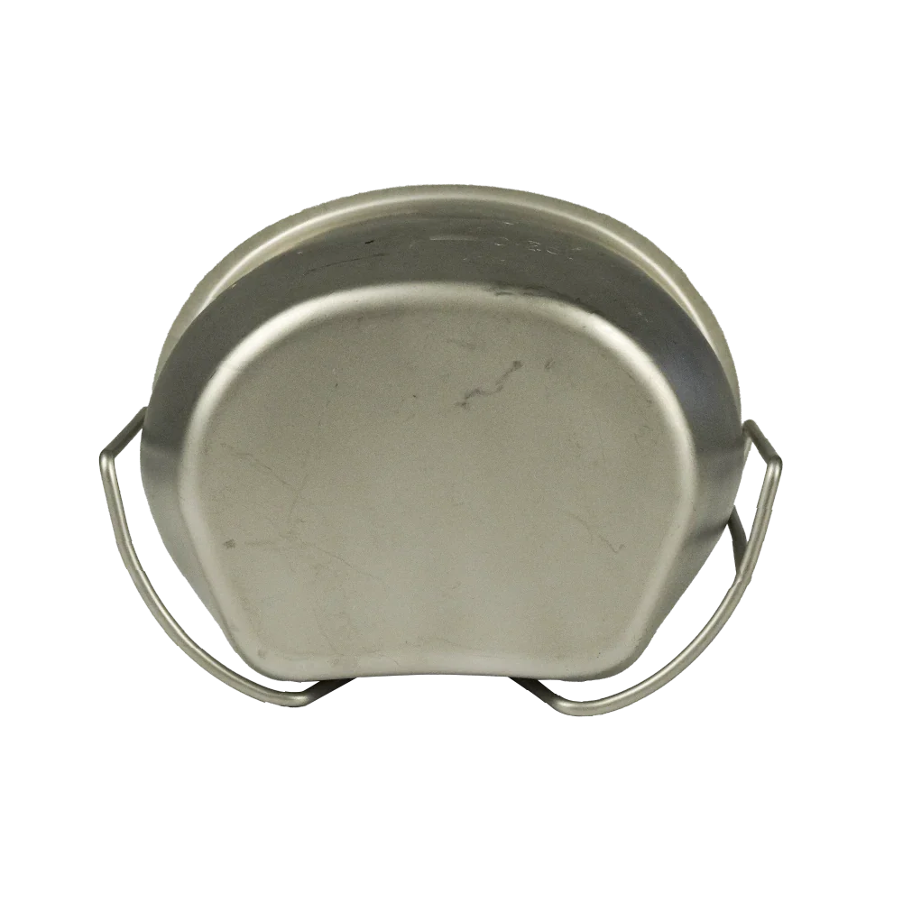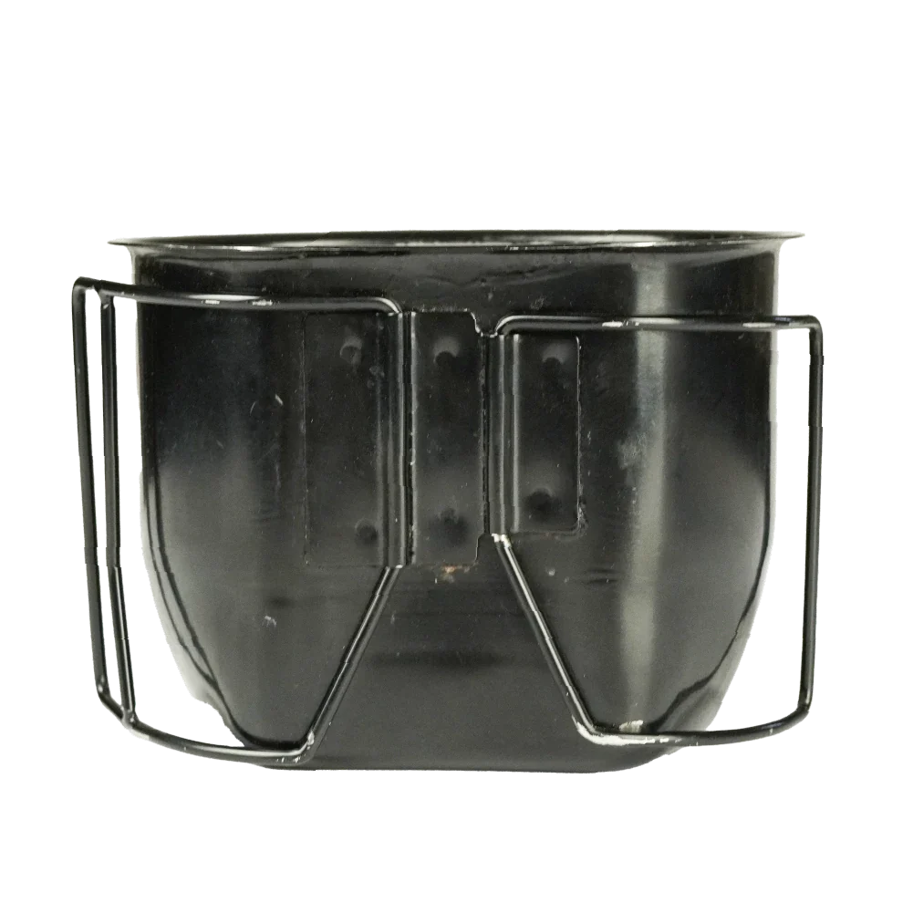 British Army steel canteen cup in used condition. The cup features a blackened exterior with a bare steel interior and is designed to fit around a standard issue canteen.