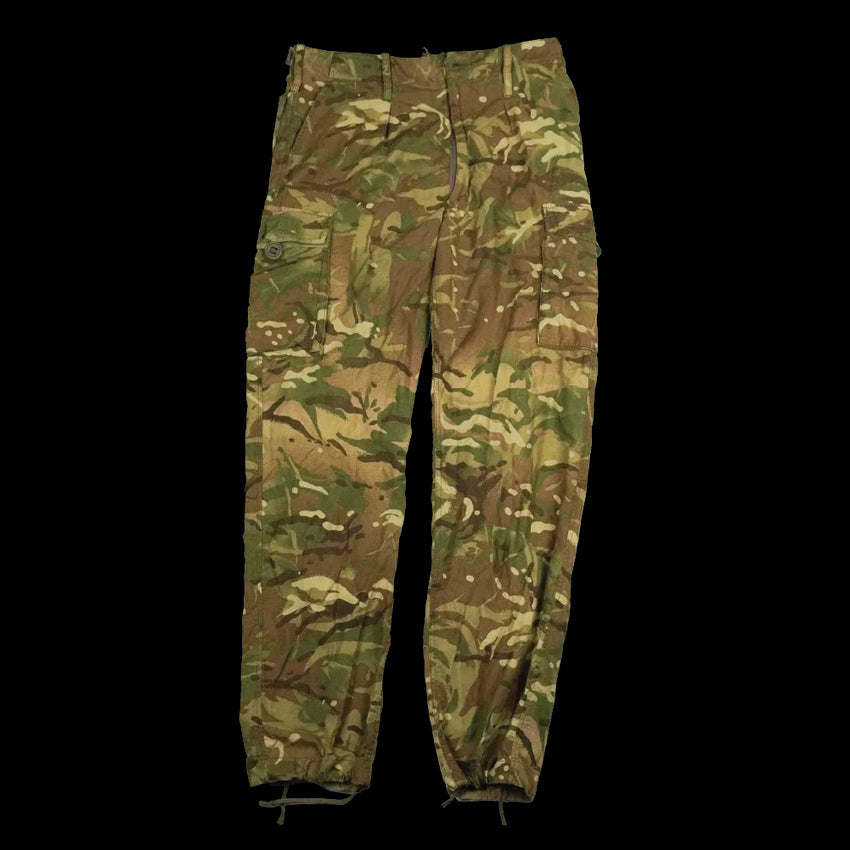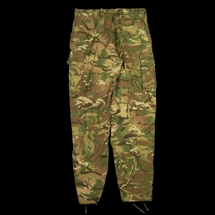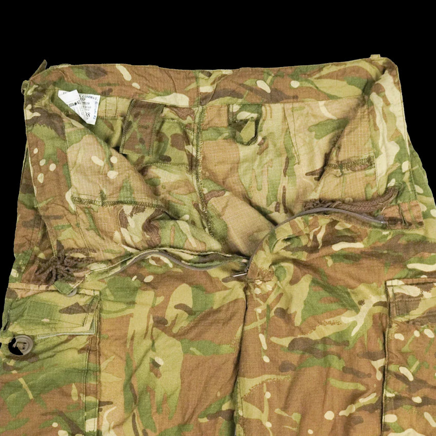 British Army flame-retardant combat trousers in the MTP pattern. These trousers feature a zip fly with storm flap and button closure, multiple pockets, and adjustable waist and leg drawstrings.
