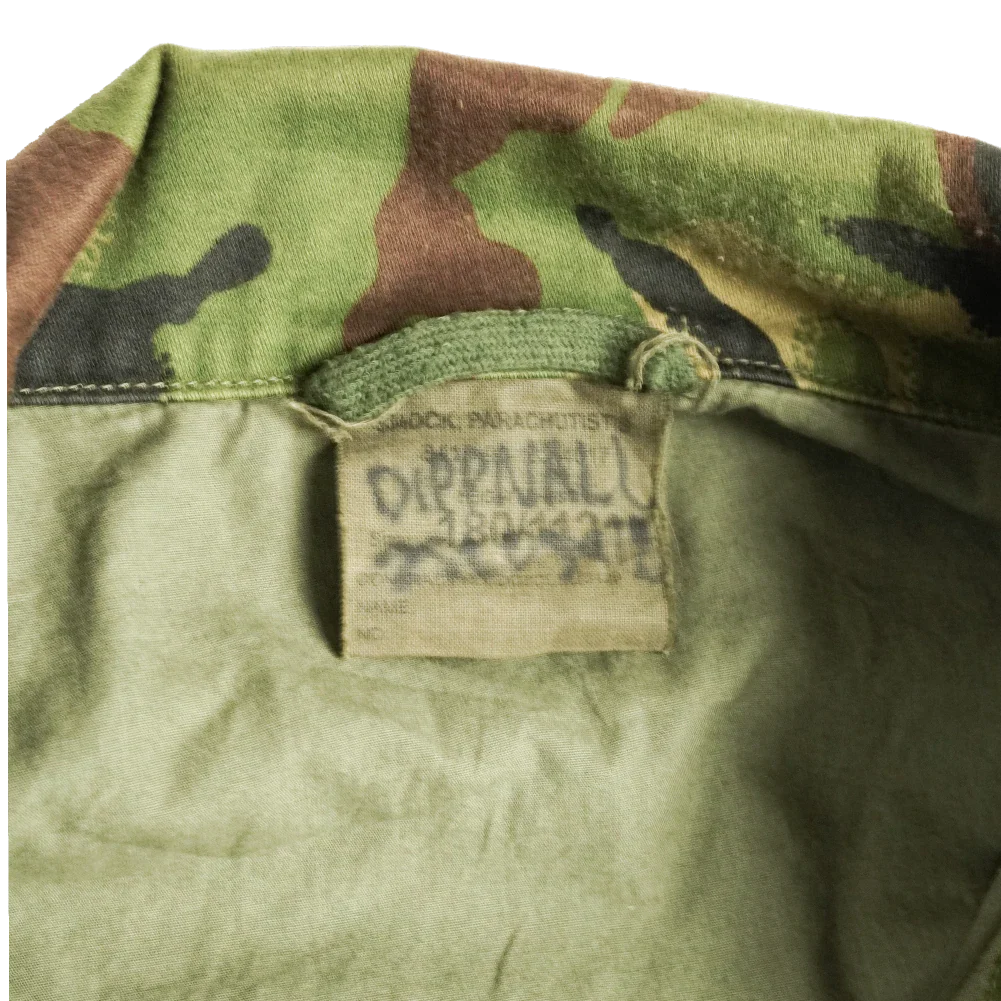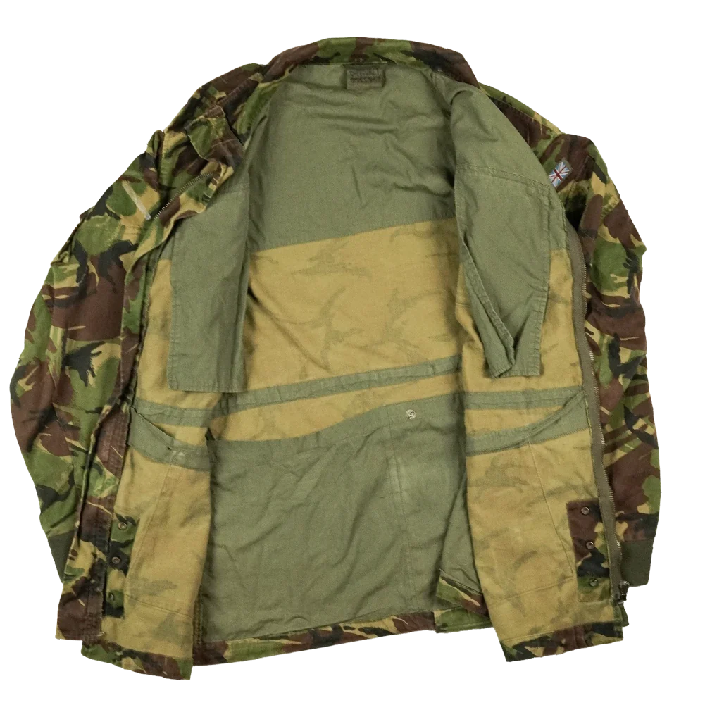 The UK DPM Parachute Smock was developed for British Army airborne forces, replacing the earlier Denison smock in the late 1970s. This example is missing the dome on the front left pocket and has adhesive marks on the right shoulder.