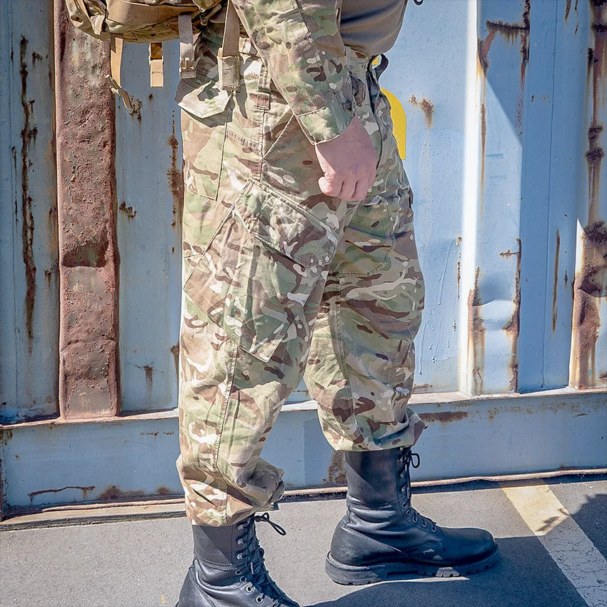 These genuine British army MTP camouflage Trousers and are tough poly/cotton blend in genuine British multi-terrain pattern material. They are very comfortable to wear and are made to army specifications performing well in all sorts of conditions. They feature; 5 pockets, zip fly with storm flap and drawstring leg ties. They have 8.5cm belt loops that will fit most military belts.