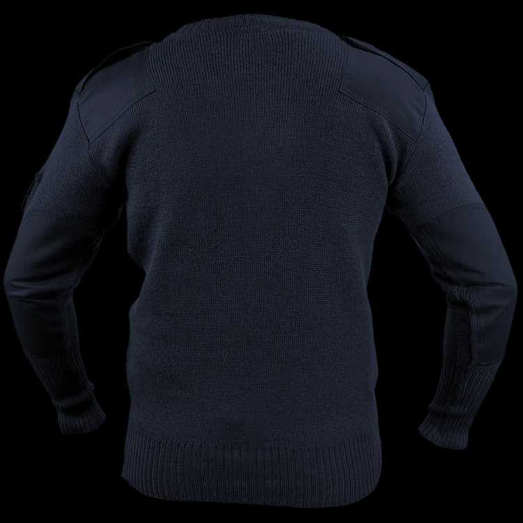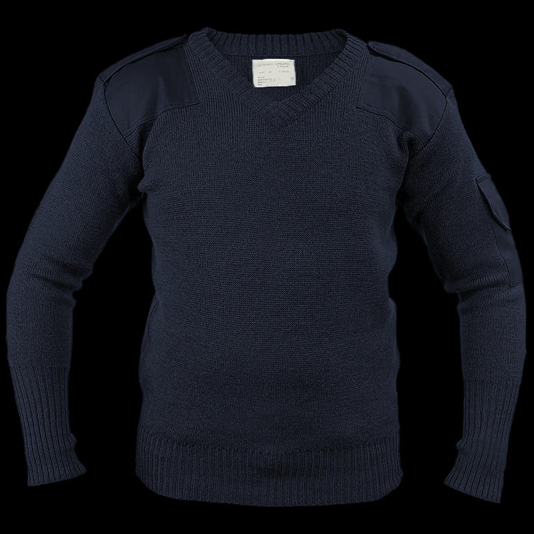 Navy-navy blue, v-neck wool blend jersey, say no more! These ''Utility'' versions do not have the wide ribbing weave like the commando style, but with a nylon blend, they are still nice and form conforming. The reinforced areas and epaulettes are really the only hint that this cosy jumper wasn't originally for the general public but it still blends in to civilian life just fine.