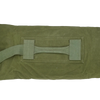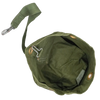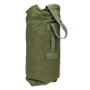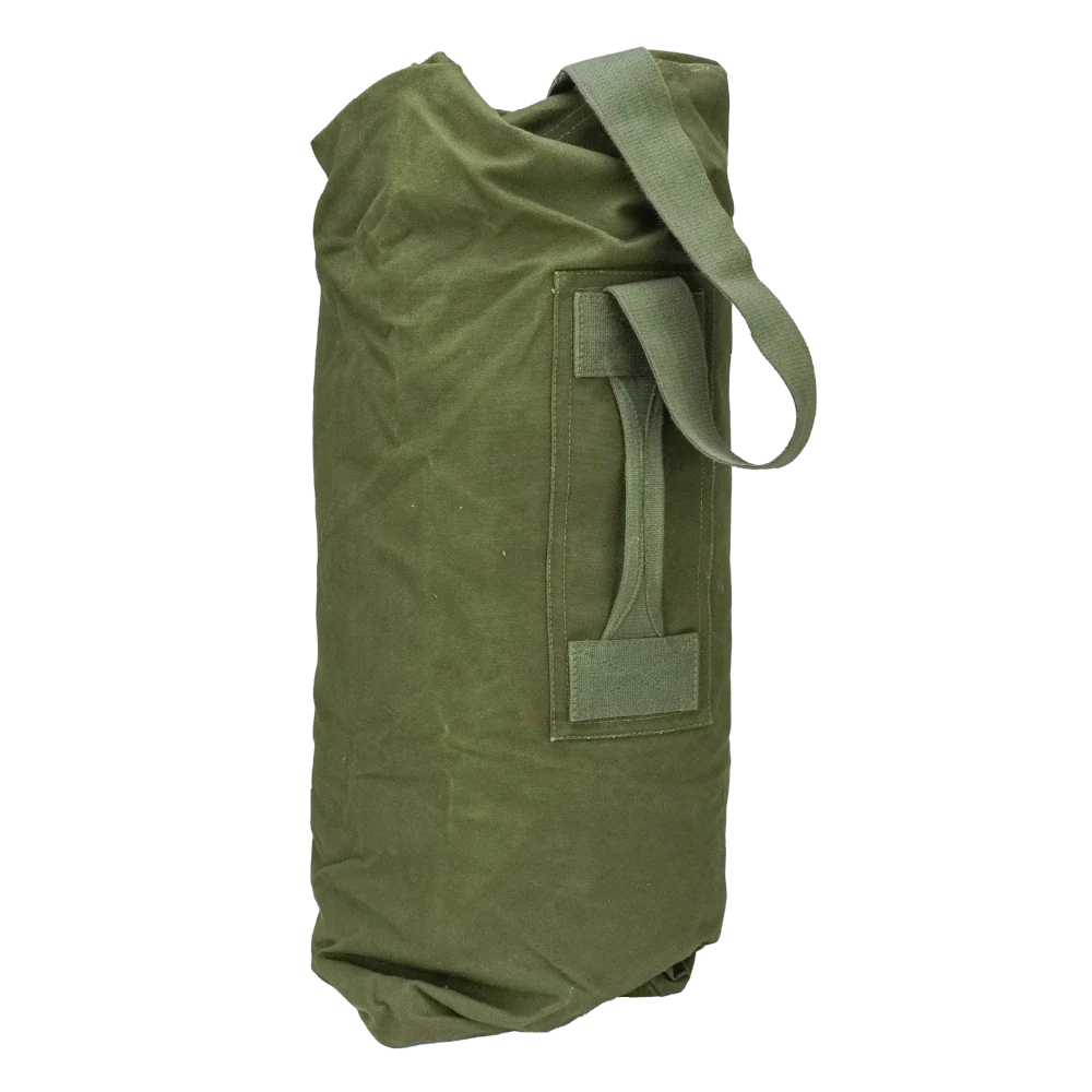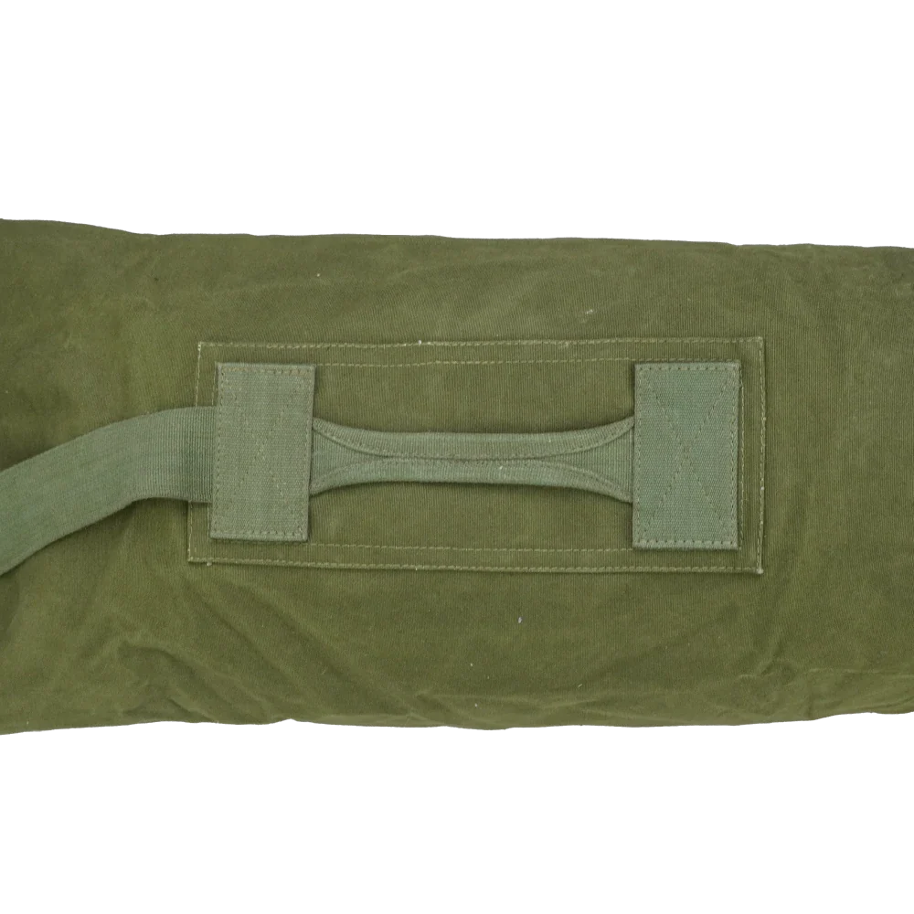 British military surplus duffel bag in olive drab. Made from canvas with a cylindrical body, featuring a reinforced carry handle stitched to the side and a webbing shoulder strap with metal clip attachment. The top opening uses metal eyelets with a hook-and-loop style closure system.