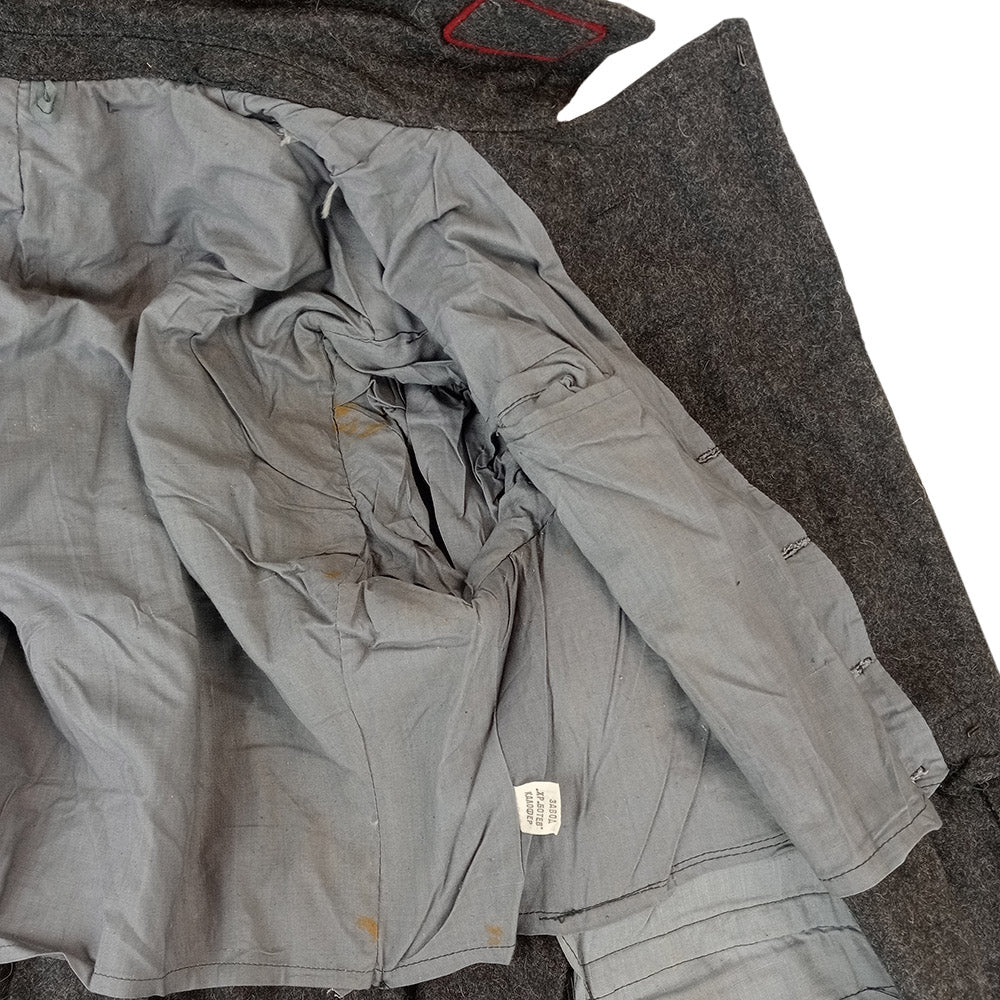 Issued during the Cold War era in Bulgaria as a full length overcoat that extends down past the knees and keeps you warm with a high wool content in the fabric. The front flap secures with six buttons, starting just below the collar and finishing at the waist. Additional details like the red trim on the epaulettes and collar make this piece stand out against other military coats. The cuffs are rolled back and stitched in place. Give yourself to the darkside and let the coat wrap you in its embrace.