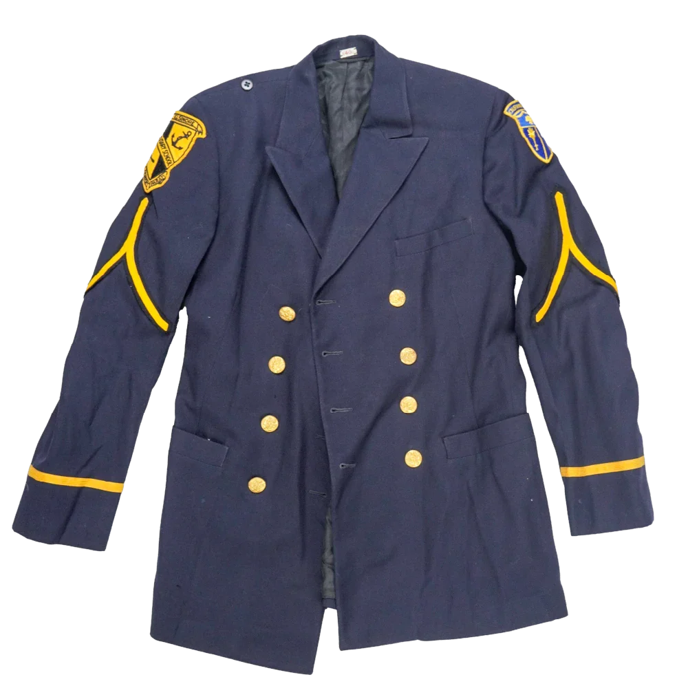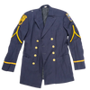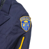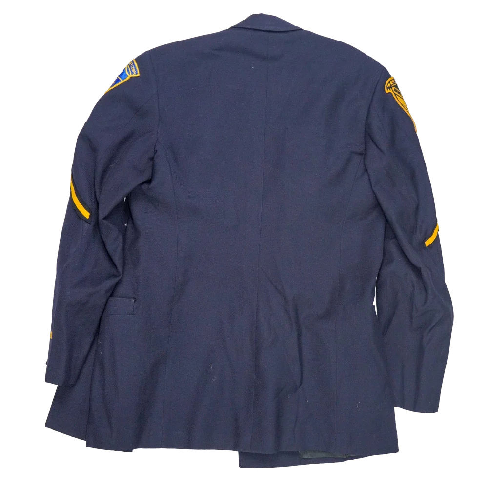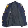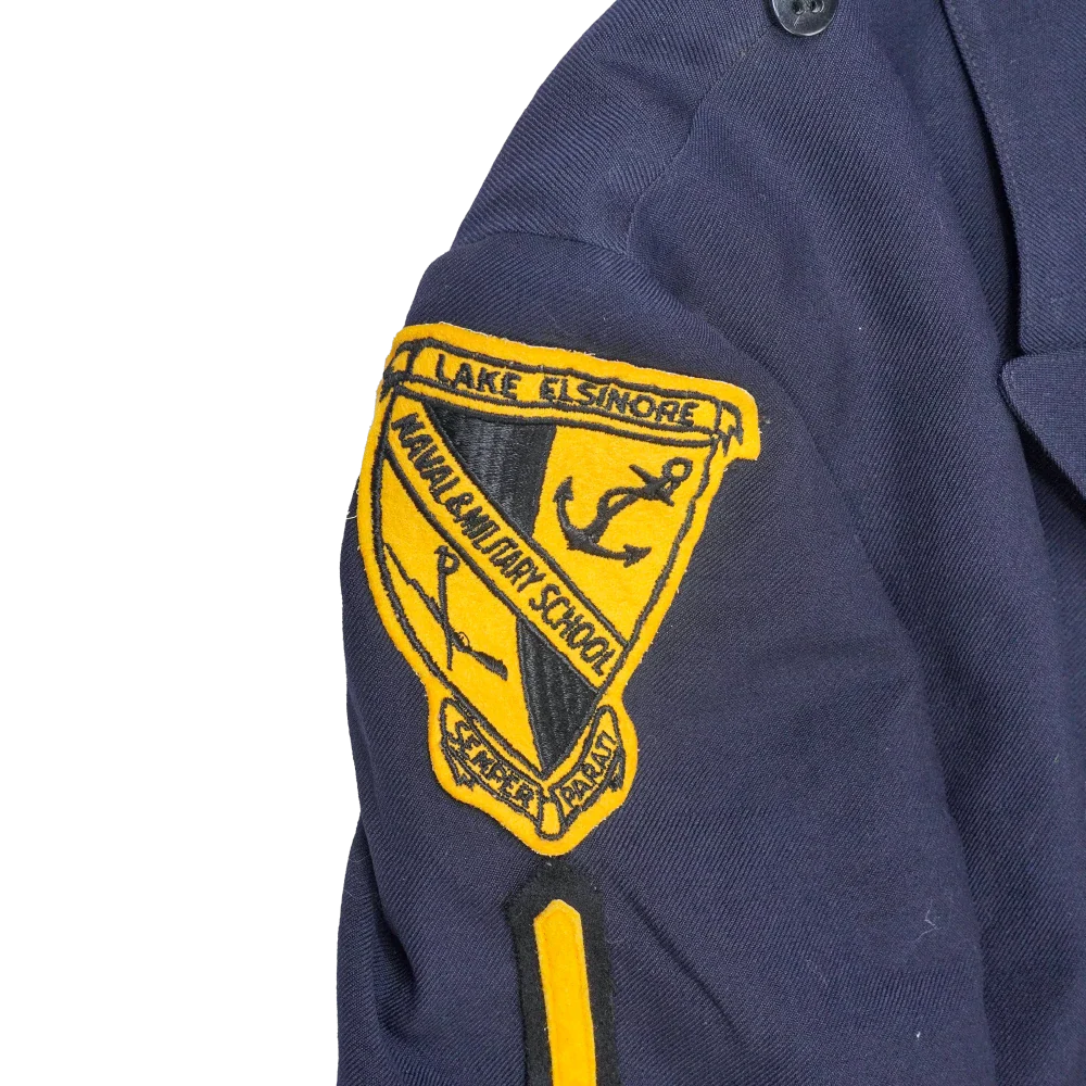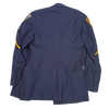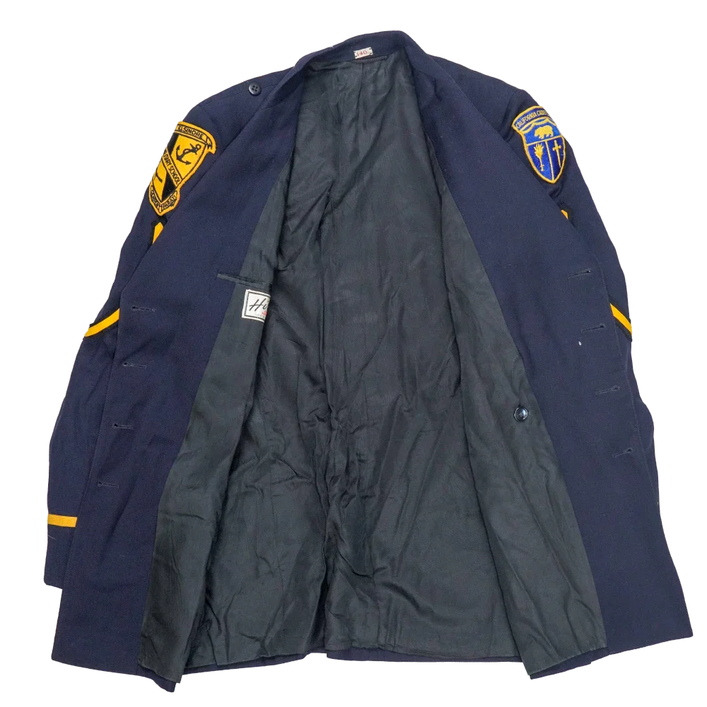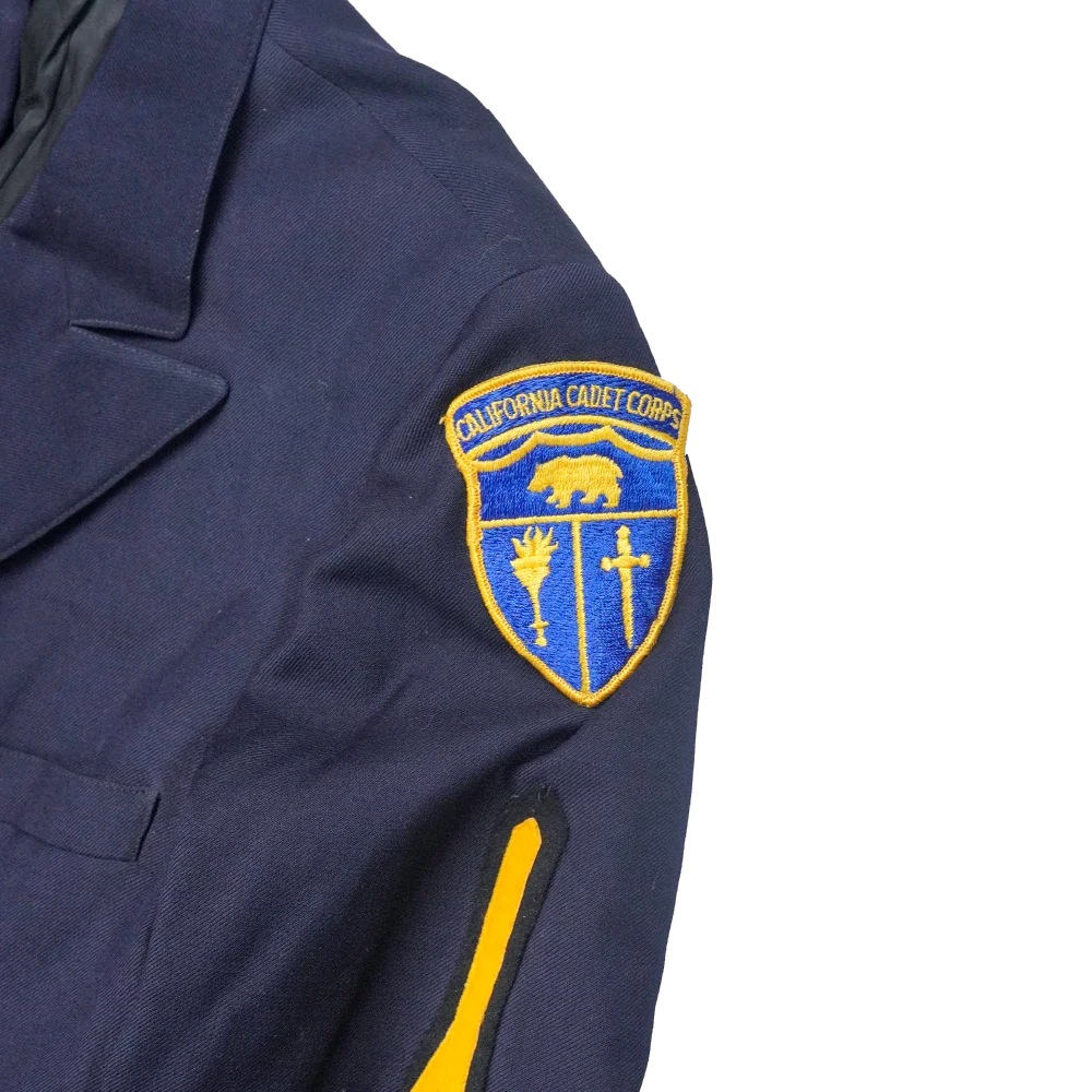 California Cadet Corps service dress jacket in small sizing. Dark navy jacket with a structured, tailored cut, featuring a full inner lining and a double-breasted front with gold-tone buttons. Shoulder epaulettes and sleeve insignia are present, including embroidered unit patches on both arms.