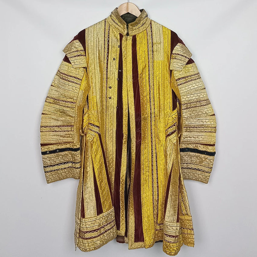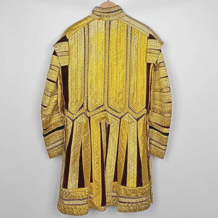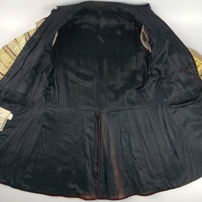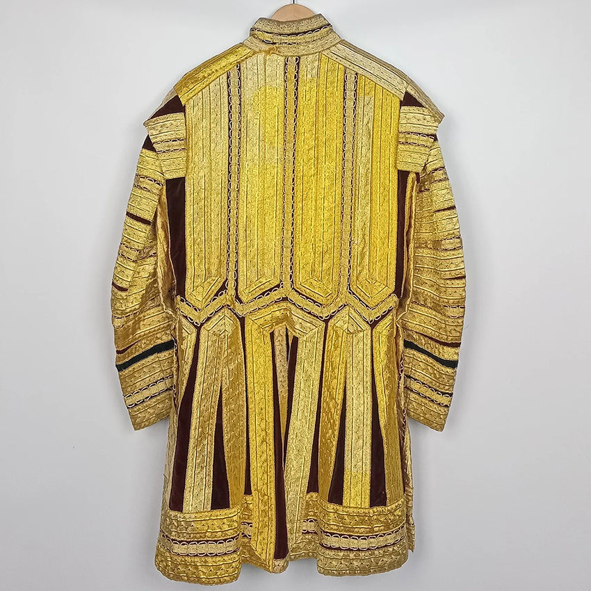 An opulent but hard worn, rare jacket from the British British Household Cavalry Band. This original British Household Cavalry Band ceremonial coat comes complete with its traditional belt. Crafted in striking deep red velvet with ornate gold detailing, it was once worn during prestigious parades and state occasions. This example shows heavy wear with some repairs, adding to its authenticity and character. The Household Cavalry Band, with origins dating back to the 17th century, is famed for its pageantry and music at royal and national events. A rare collector’s piece.