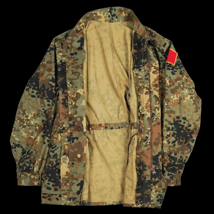 Chinese PLA Type 03 camouflage jacket in the Tibet-Tarn pattern. Features a button and zip front closure with a drawcord adjustable waist and multiple pockets.