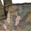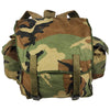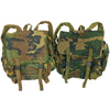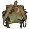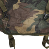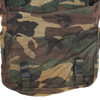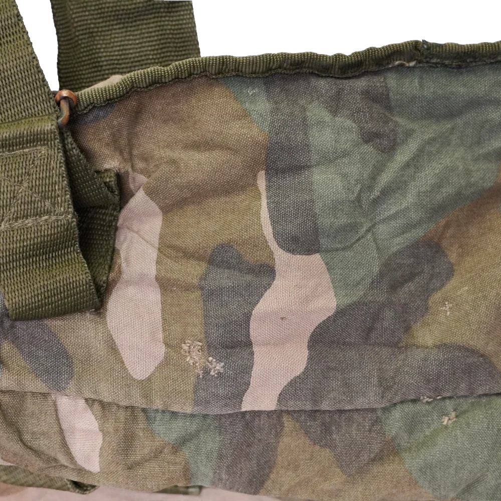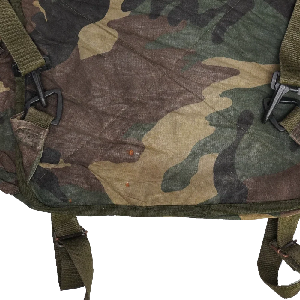Croatian Army woodland camouflage backpack in used value grade condition. Constructed from cotton canvas with a main compartment, front pocket and two side pouches. The side pouches feature hook & loop closures and the main compartment is secured by a strapped top flap. Shoulder straps can be unclipped at the base and clipped together to form a single messenger-style strap.