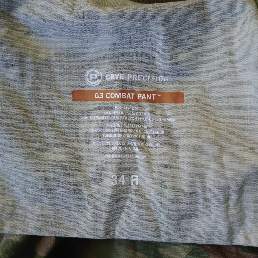 Crye Precision G3 combat pants in Multicam camouflage. This pair is size 34R with articulated construction typical of the G3 pattern.