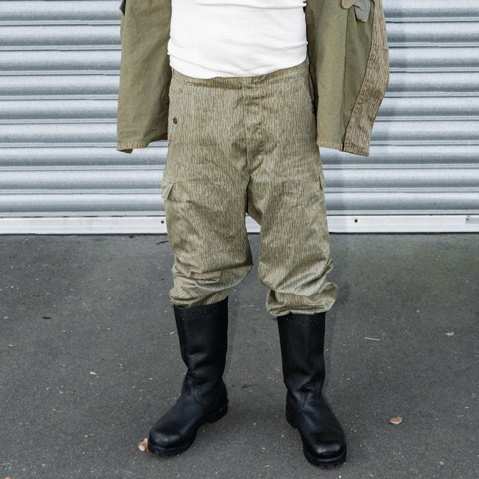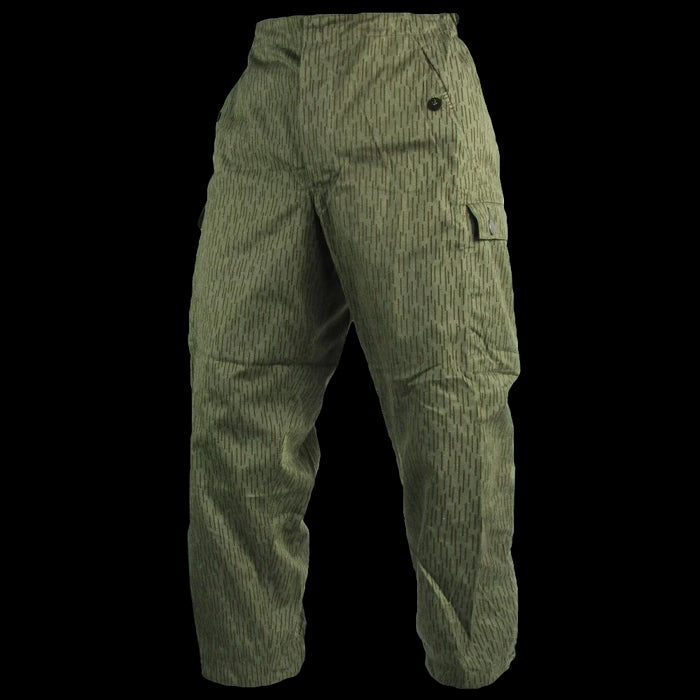 These combat trousers made their way into The National People's Army of East Germany for over 30 years. Starting in 1968, they were manufactured and issued up until 1990. The Rain Camo pattern (Strichmuster) was influenced by WW2 German designs such as Splittermuster and Sumpftarn. "Rain" refers to the camouflage pattern, these are not waterproof trousers. Due to the range in manufacture, have a mix of models. Some may have no knee reinforcement, square reinforcement or polygonal reinforcement, seat reinforcement and some may have shrouded cargo buttons and others not. These will be picked at random.