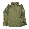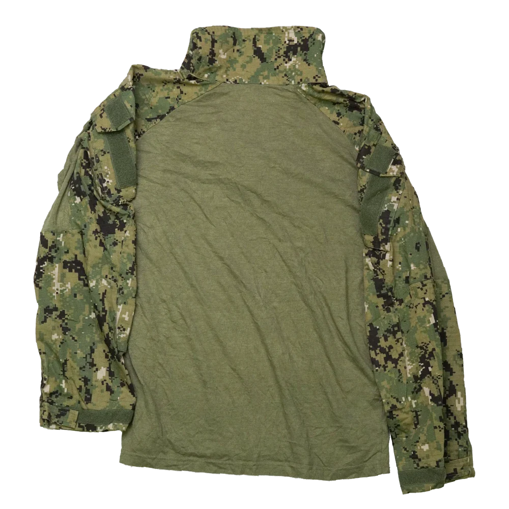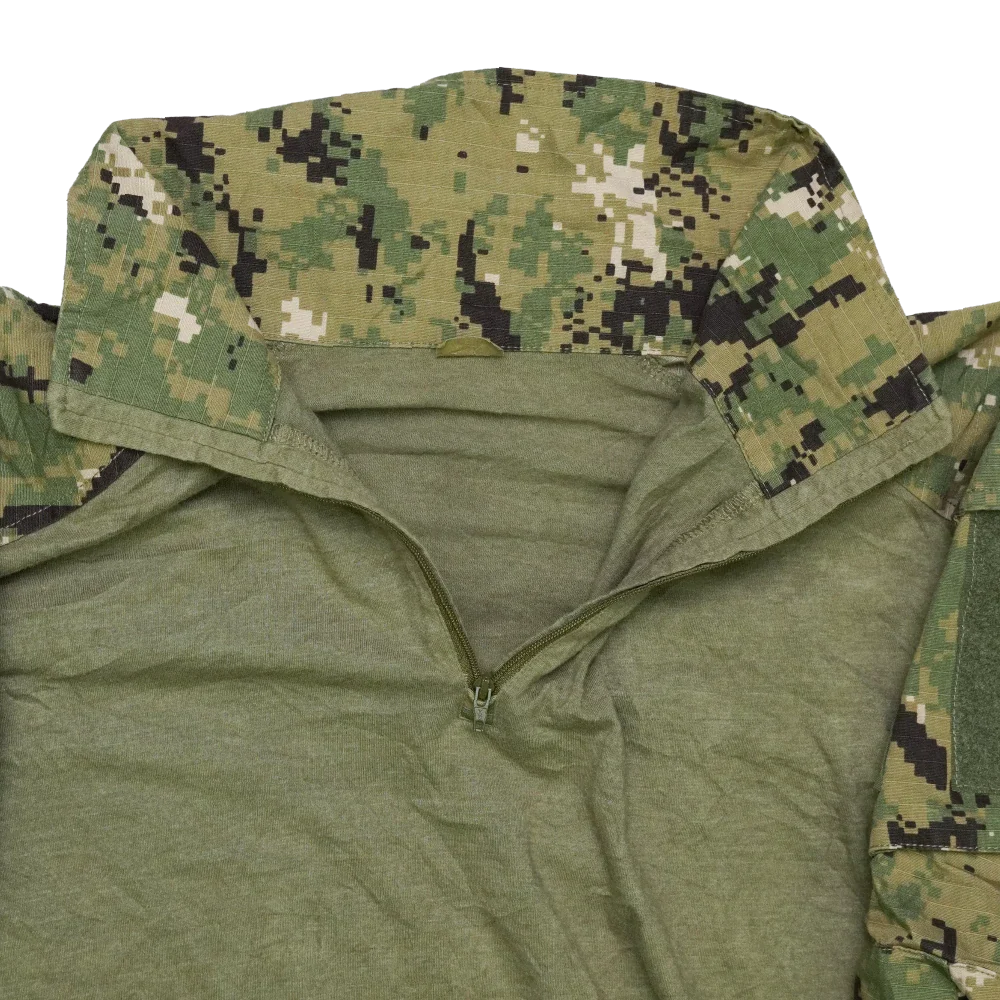 Emersongear AOR2 ‘Crye G3 Cut’ combat shirt in a digital AOR2-style camouflage. Olive drab knit torso with a short front zip collar. Sleeves are ripstop fabric with upper arm pockets and hook-and-loop panels for patches.
