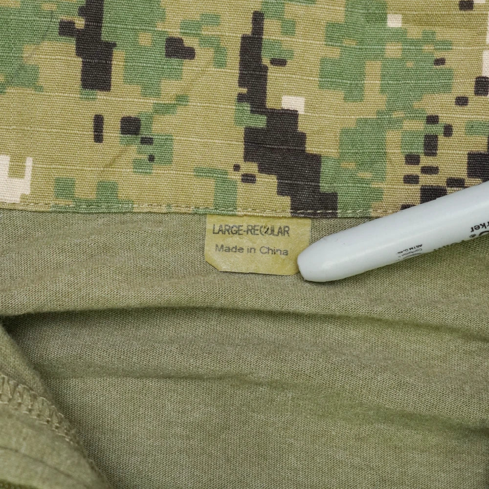Interior label shows polyester/cotton blend construction with ripstop yoke panels. Made in China.