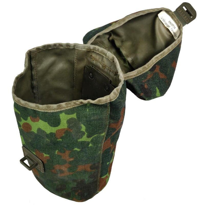This genuine issue flecktarn camouflage pouch is used to carry the Bundeswehr (German Army) 3 piece canteen set. The pouch is also suitable for the British 58 pattern water bottle or a US canteen. Attach this to a German harness system or pick up a German-to-ALICE adapter to attach the pouch to a wide range of gear. The lid closes with a simple Spanish-fly buckle. Add this to your flecktarn setup or bring it along to your next hike or hunt.
