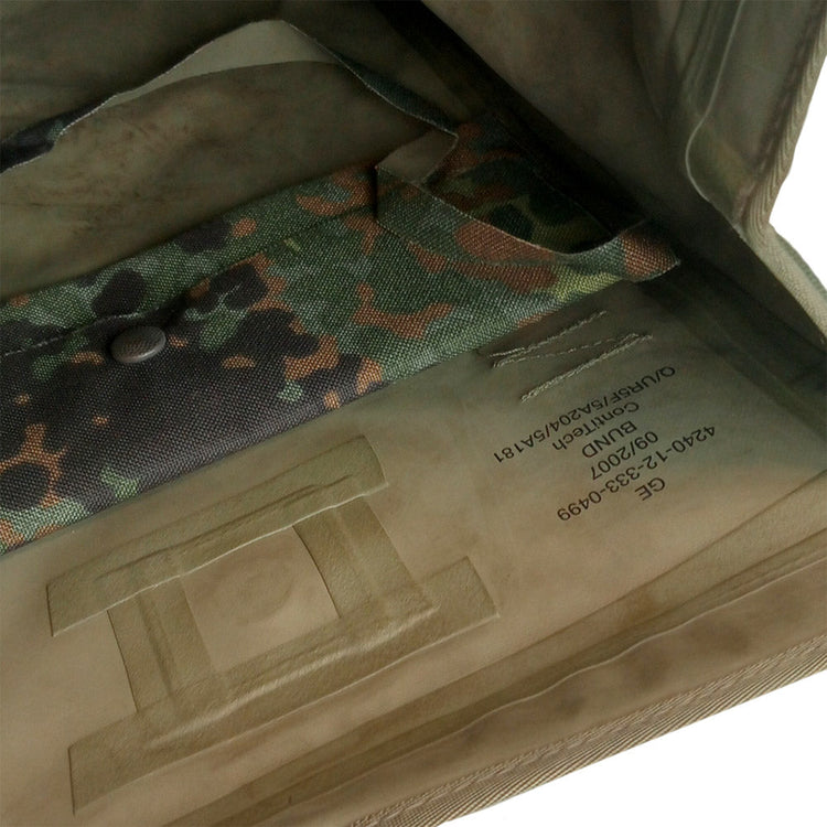 The bag is opened by pulling on and releasing a rubber strap and unfolding the top. Storage is simple - just one main compartment with a small sub-pocket to store things like spare lenses etc. You can carry this bag over your shoulder with a fixed length strap or you can unpick it and integrate the bag onto a Bundeswehr web belt system, using the attachments on the back.