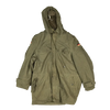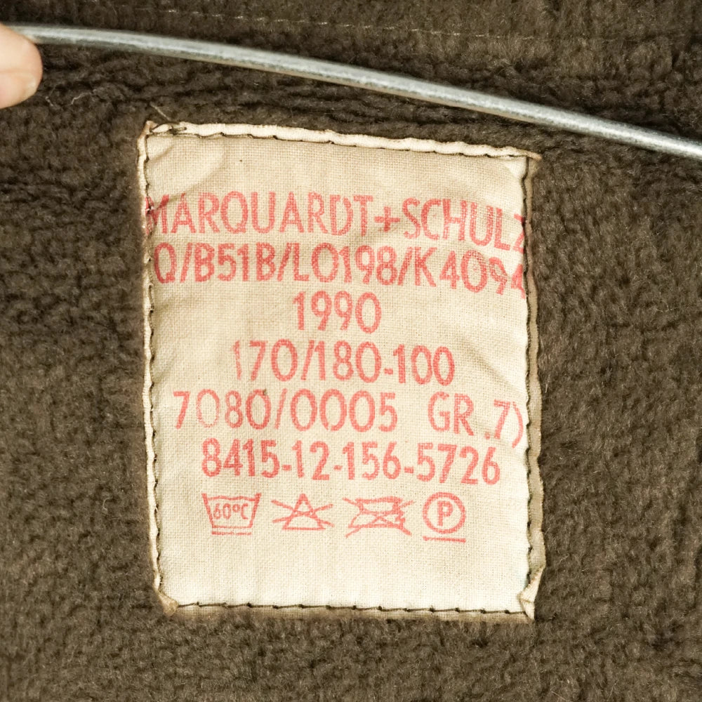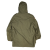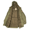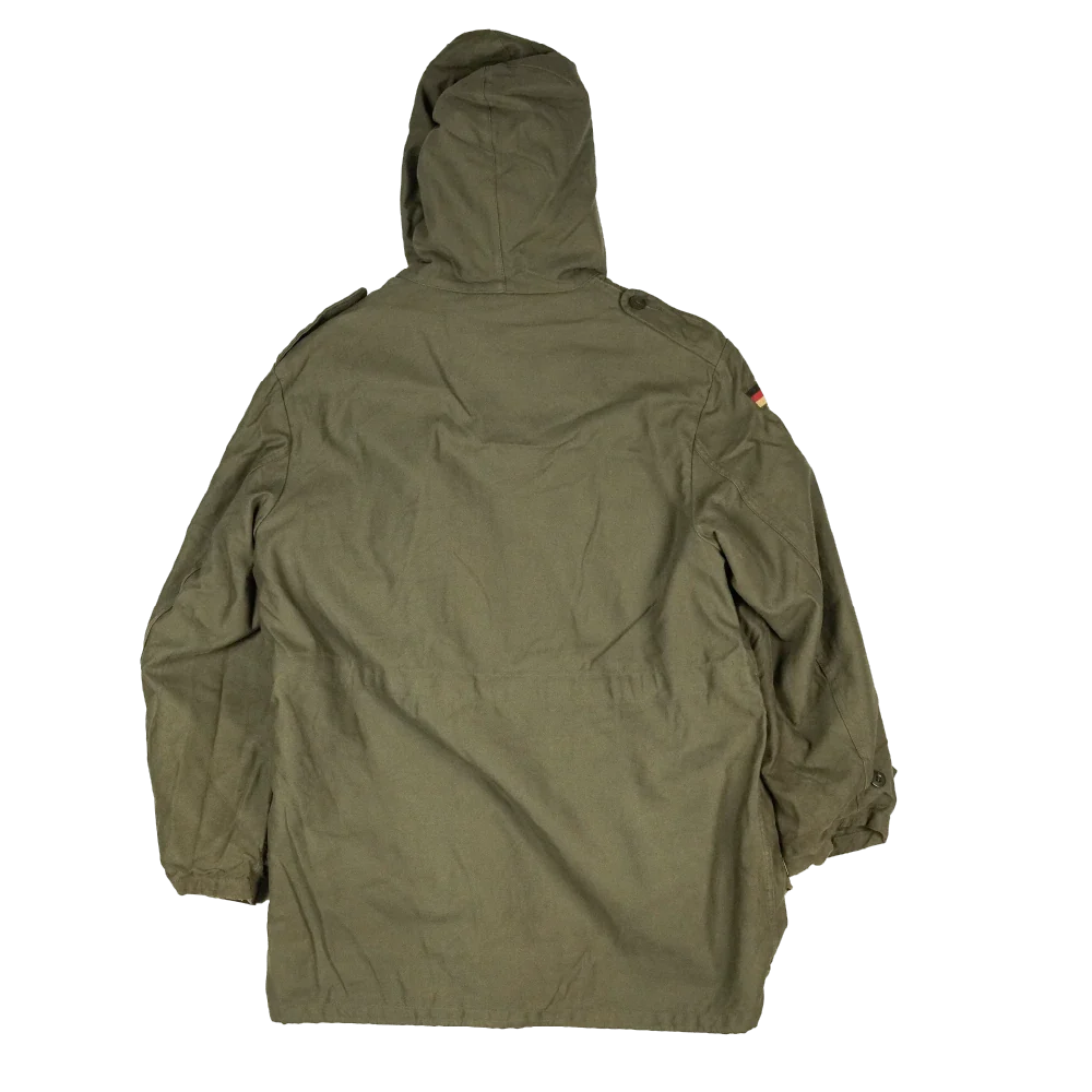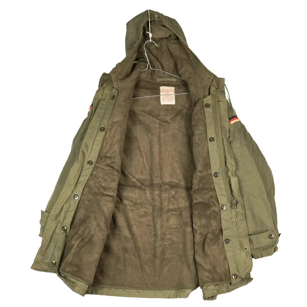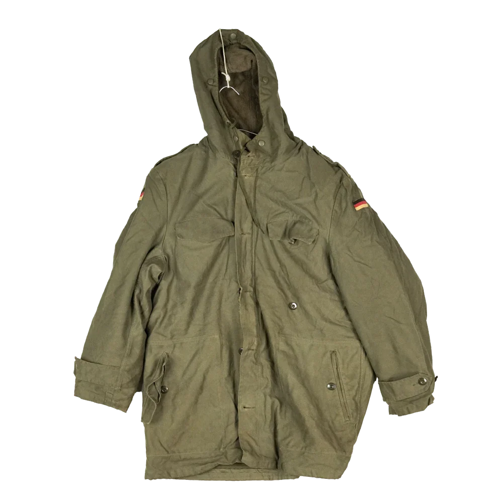 German military surplus parka in a plain olive drab finish. This is a full-length cold-weather jacket with a removable insulated liner and multiple external pockets. Construction follows a practical, utilitarian cut typical of European surplus outerwear.
