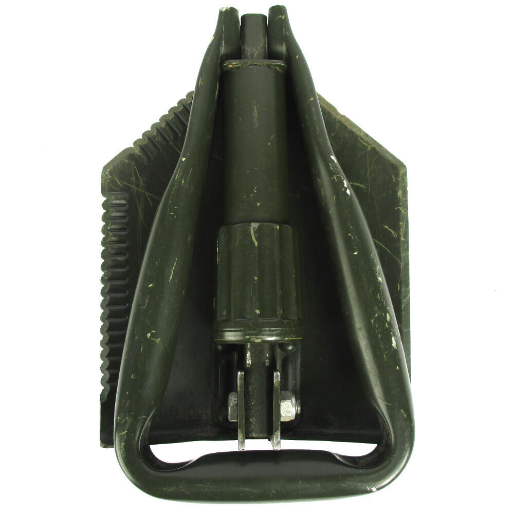 These collapsible shovels are engraved with "BUND", meaning Bundeswehr - the German Armed Forces. Built to NATO specifications, this steel shovel is able to be configured in to three different forms. Fully extended, this shovel is ideal for standard digging use. The shovel head can be locked in a 90 degree position, making a mattock-like shape. This is good for vertical digging. The final configuration fully collapses the shovel in to a compact form for carrying around.
