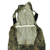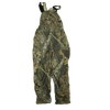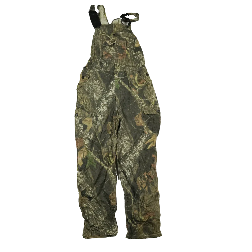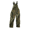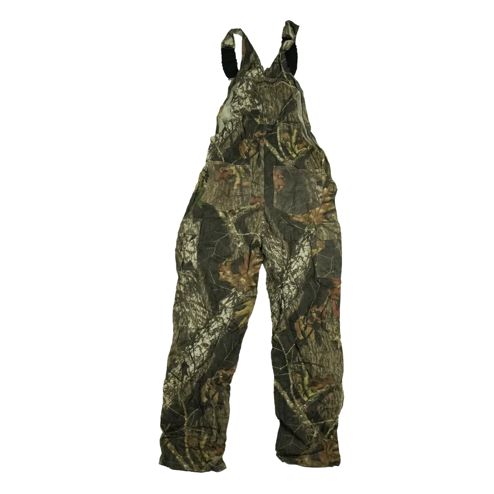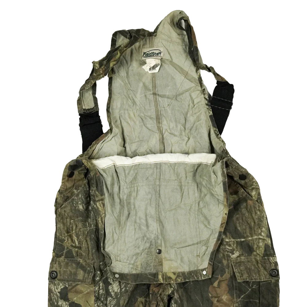 Commercial hunting-style bib overalls in a woodland camouflage pattern. FieldStaff brand, with adjustable shoulder straps and multiple utility pockets.