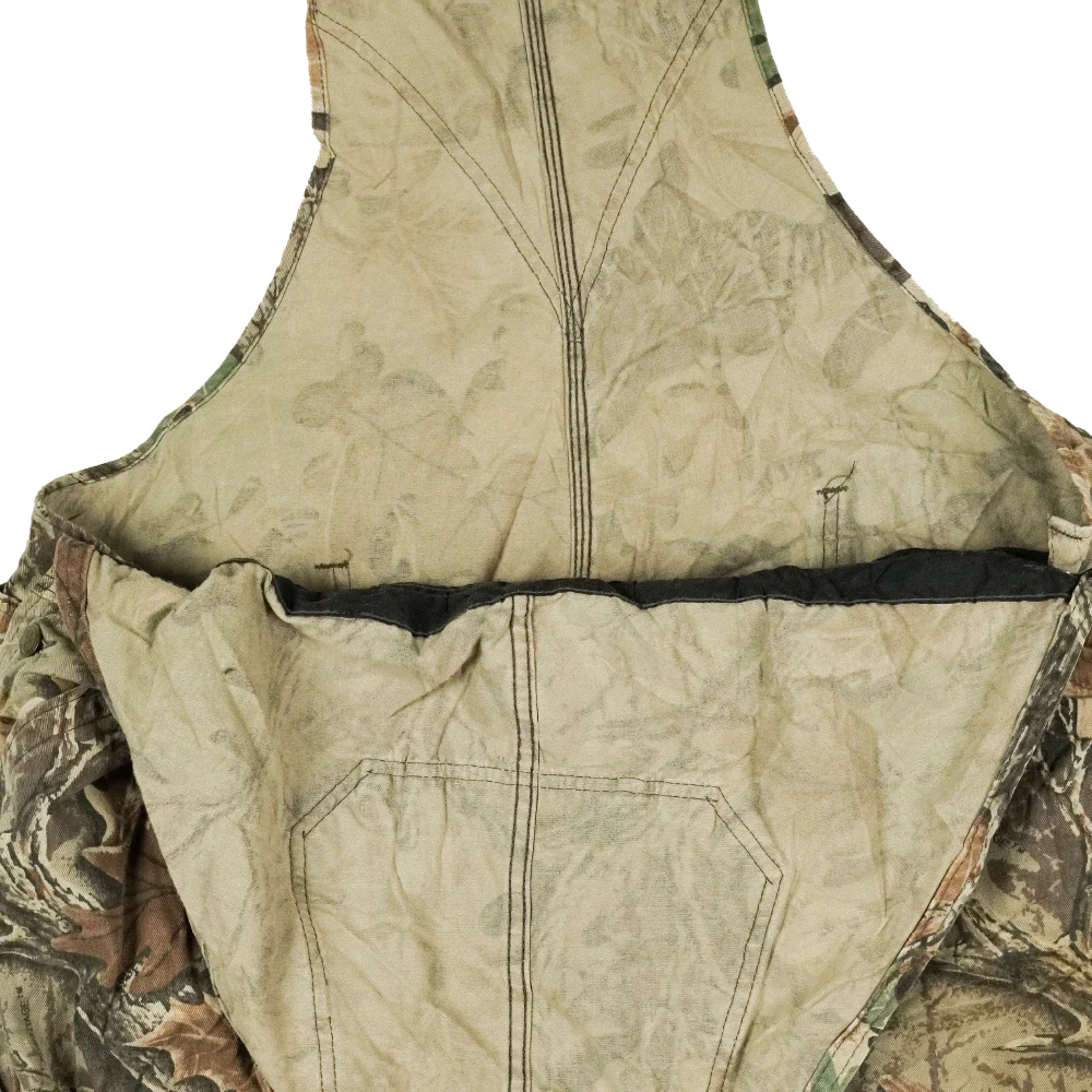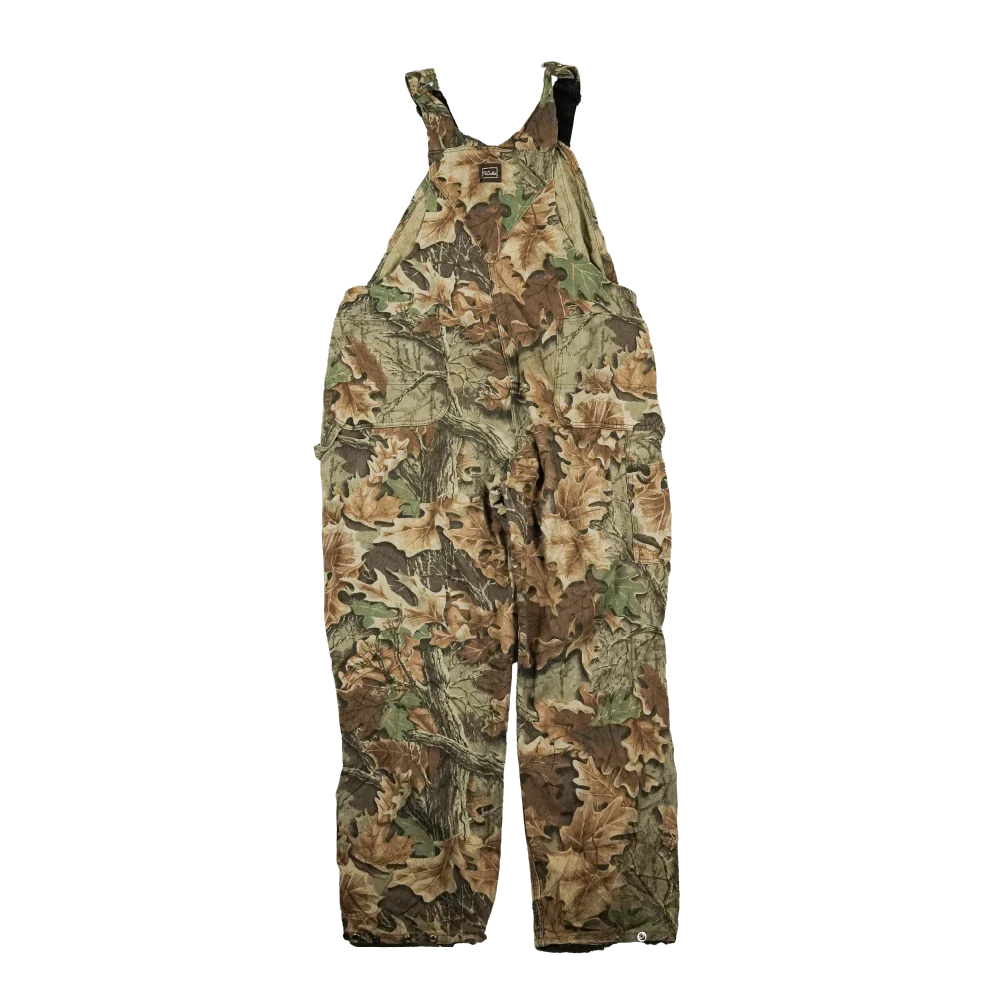 Commercial hunting camouflage coveralls. One-piece coverall garment with an all-over camouflage pattern.