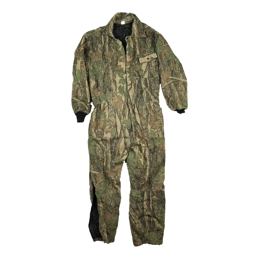 Commercial hunting camouflage insulated overalls. One-piece overall construction with insulation for cold-weather wear. Made in the USA.