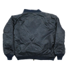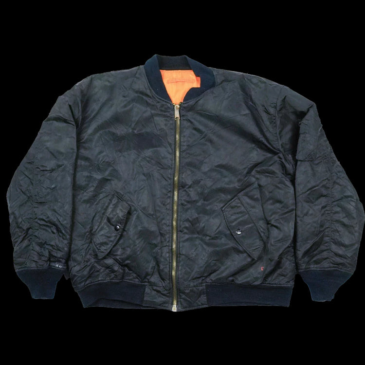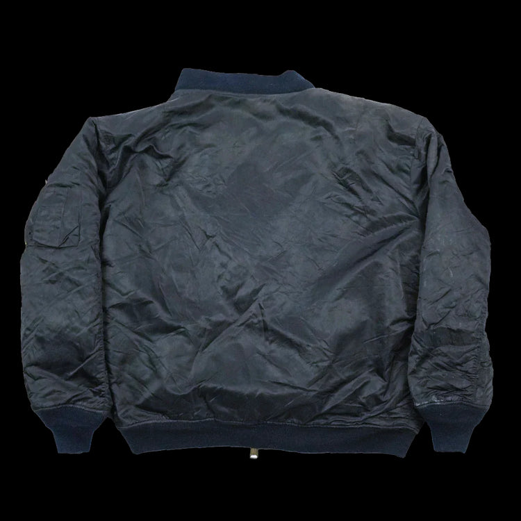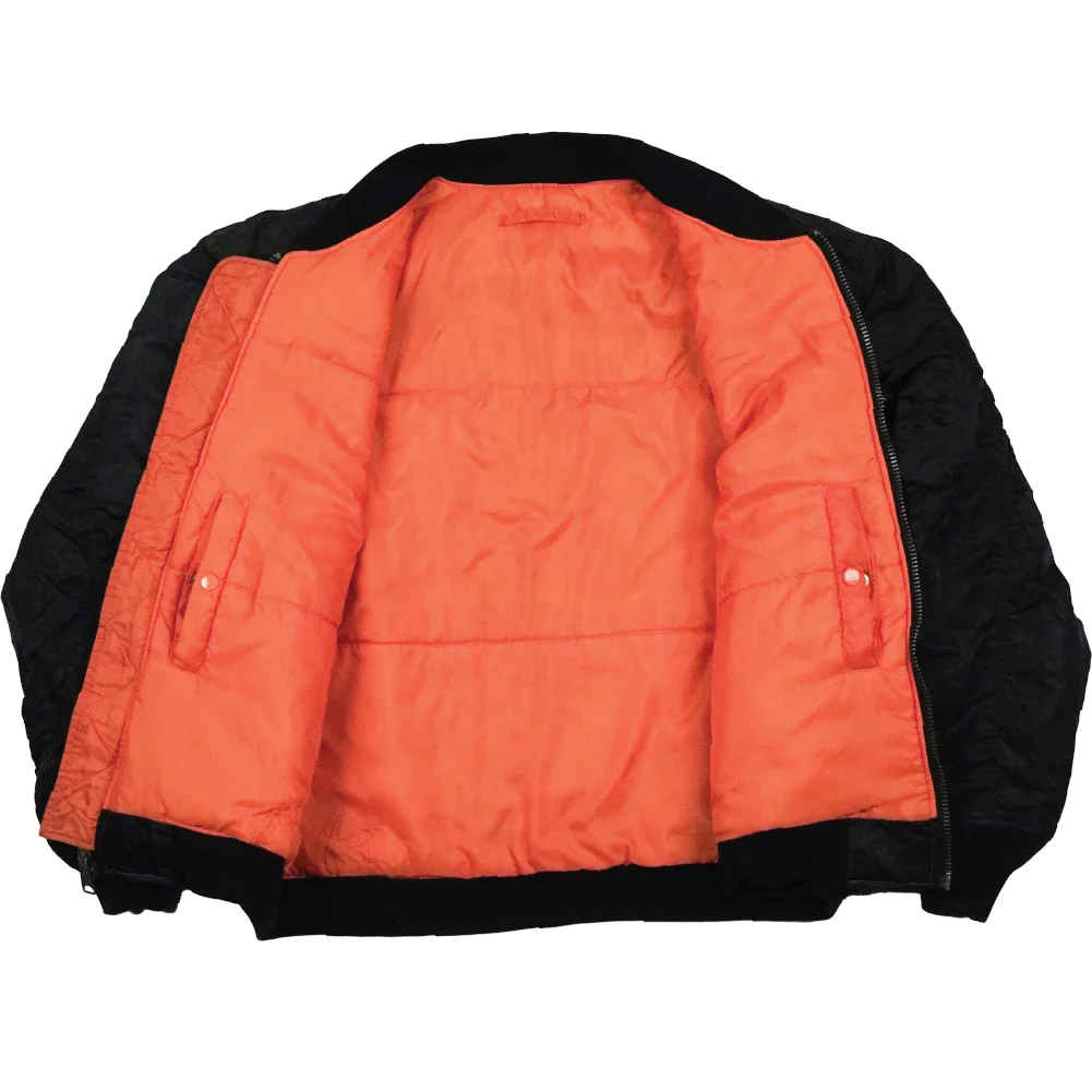 Commercial MA-1 style flight jacket in black. Nylon and polyester construction with elasticated collar, cuffs, and waist. Features multiple pockets including interior storage with dome fastening.