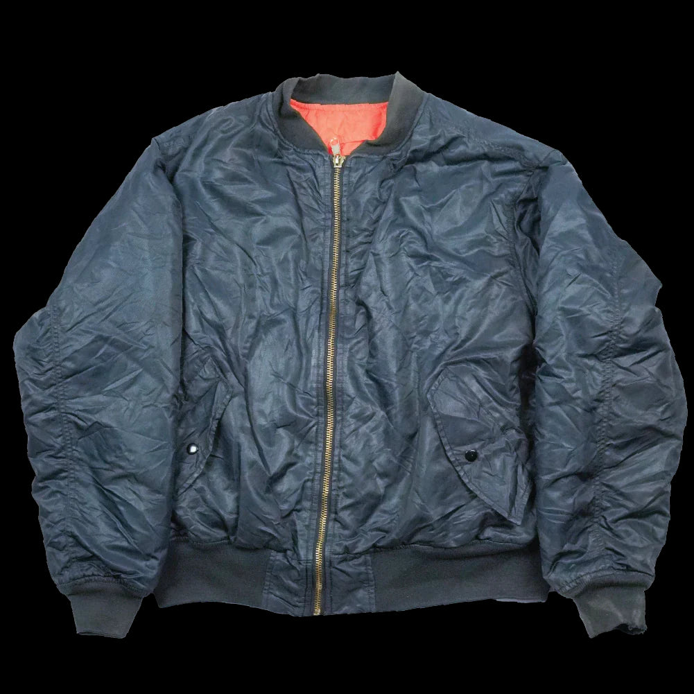 Commercial MA-1 style flight jacket in black. Constructed from nylon and polyester with elasticated collar, cuffs, and waist, and a zip front closure. Storage includes waist pockets, interior pockets with dome fastening, and a utility/pen pocket on the left sleeve.