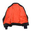 Commercial MA-1 black flight jacket in used/very good condition. Black nylon outer shell with bright orange lining and polyester fibre fill insulation. Features a full front metal zip closure and rib-knit collar, cuffs, and waistband.