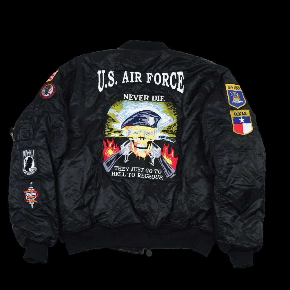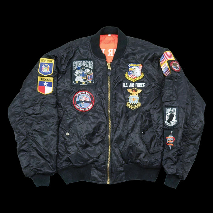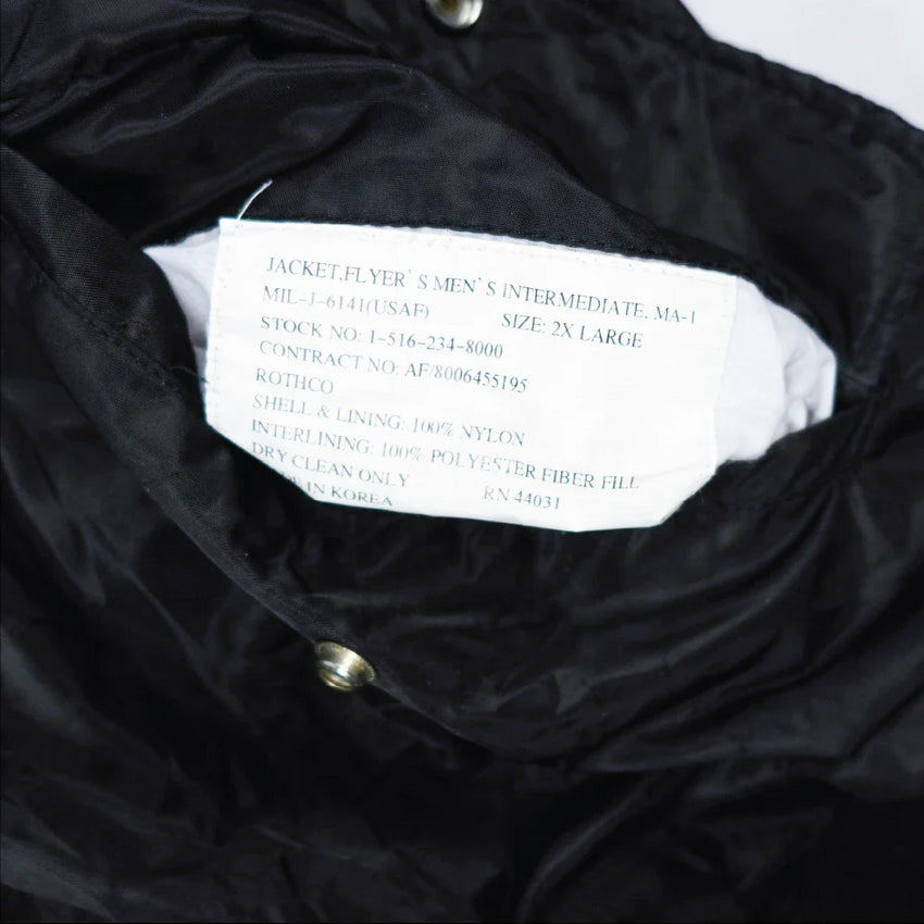 Commercial MA-1 style flight jacket with a reversible design. Constructed from nylon and polyester, with an elasticated collar, cuffs, and waist. Features multiple pockets including sleeve, waist, and interior storage. One side reverses to high-visibility safety orange.