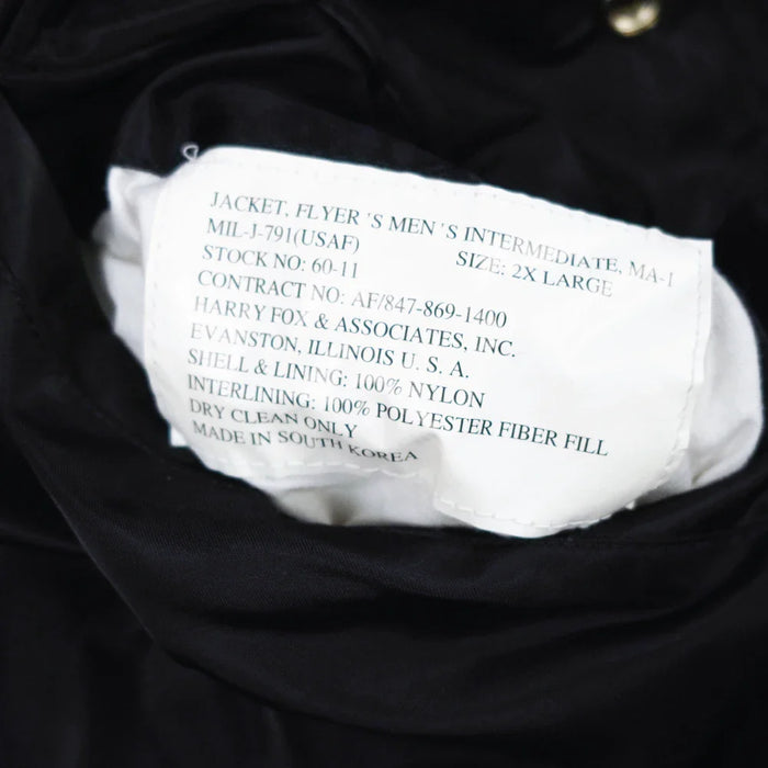 Commercial MA-1 style flight jacket with a reversible design. Nylon and polyester construction with elasticated collar, cuffs, and waist. Features multiple pockets and a safety orange reverse side.