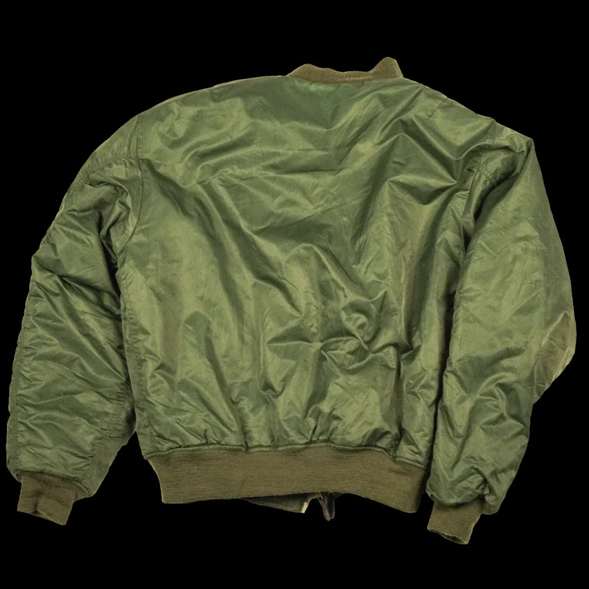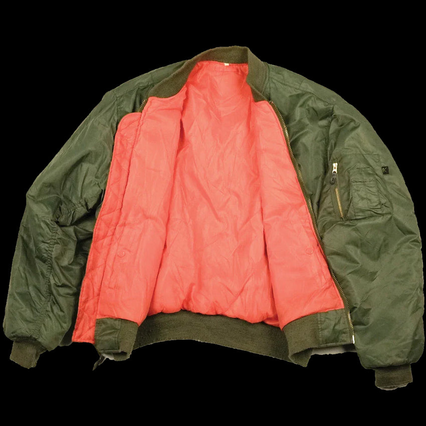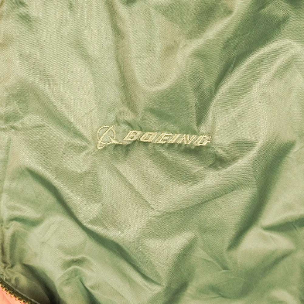 Commercial MA-1 style flight jacket in olive drab, featuring an embroidered Boeing logo. Classic bomber jacket design with rib-knit collar, cuffs, and waistband.