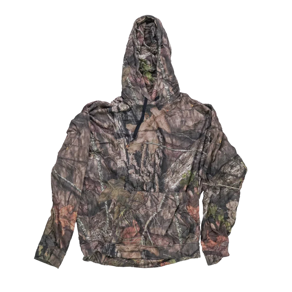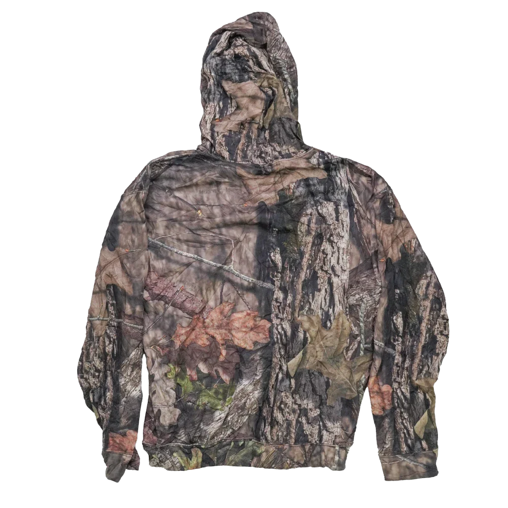 Mossy Oak camouflage hoody with an all-over camo pattern. Standard hooded sweatshirt construction with long sleeves and a pullover design.