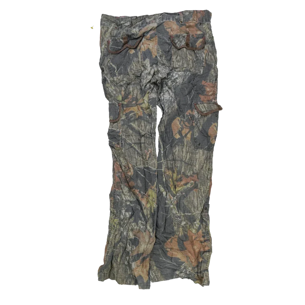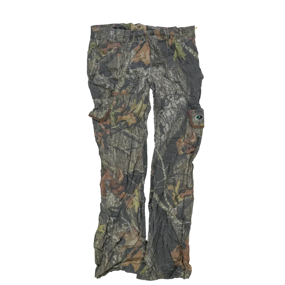 Commercial Mossy Oak camouflage trousers made from ripstop fabric. The trousers feature a lightweight construction with a durable woven ripstop pattern designed to resist tearing.