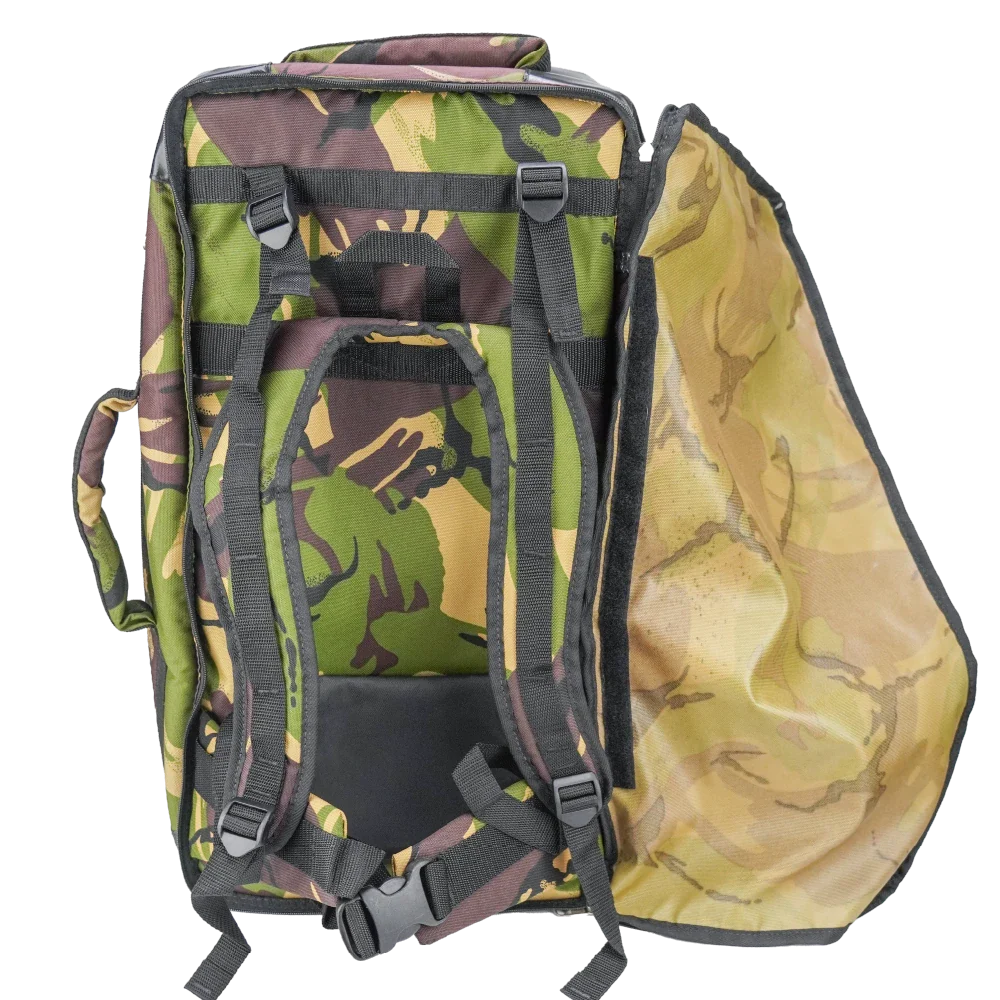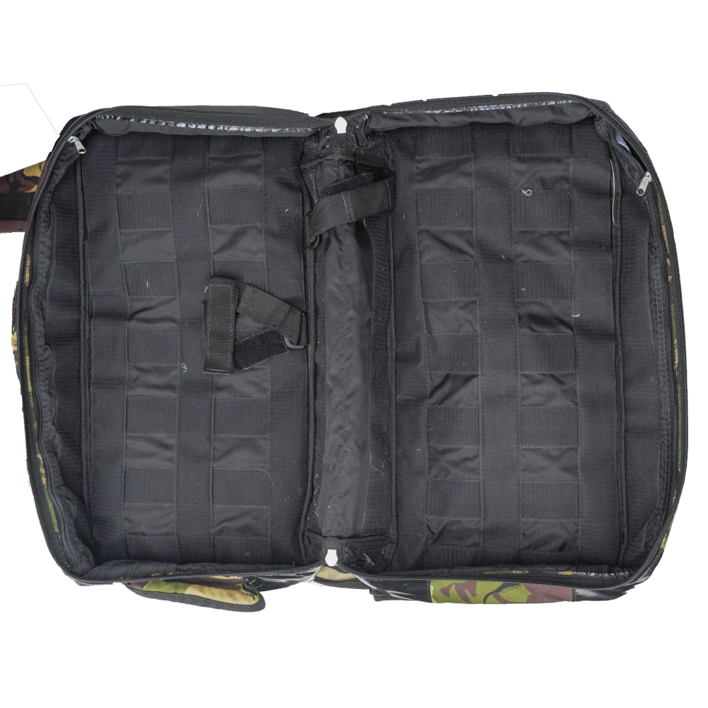 New Zealand Army DPM medic bag in camouflage pattern. It has a velcro-lined interior for attaching inserts or internal components.