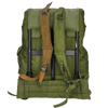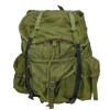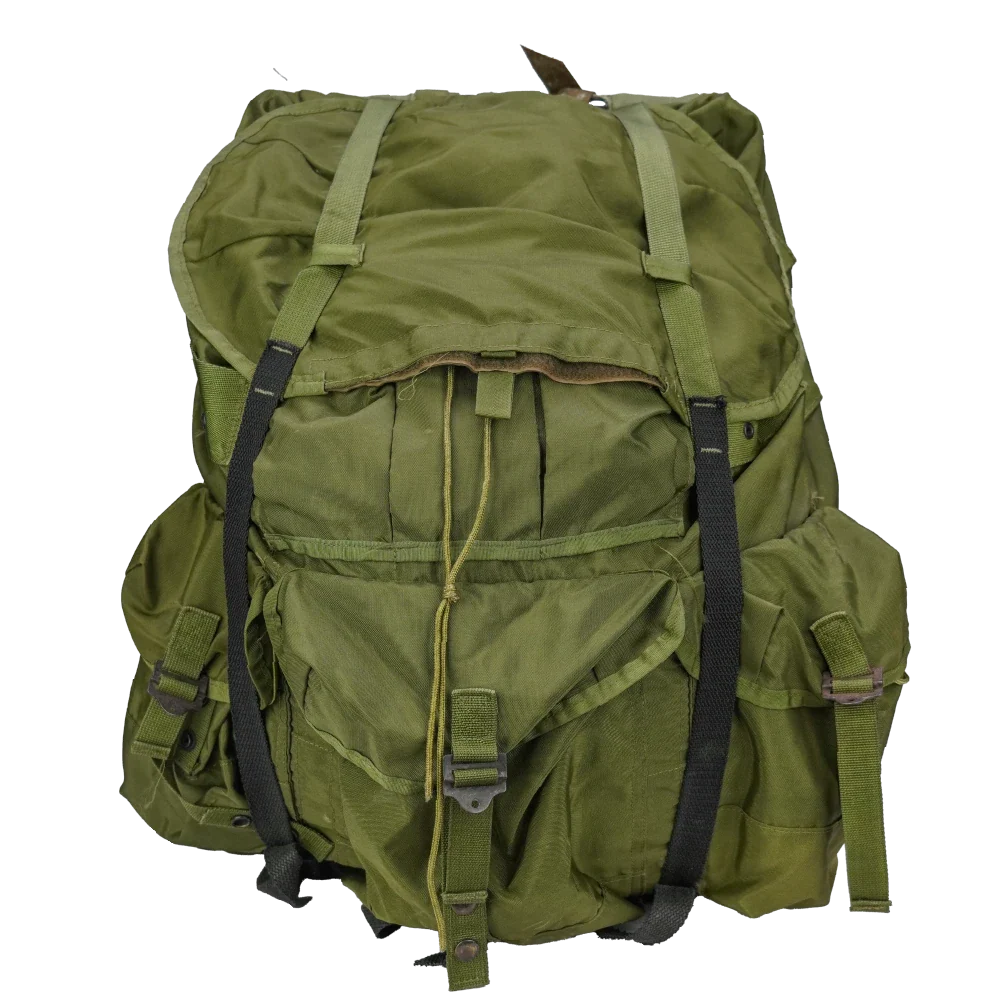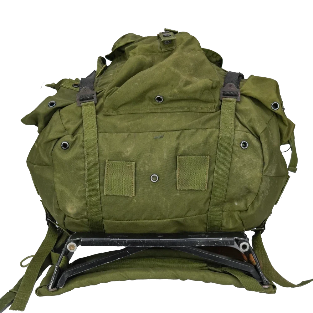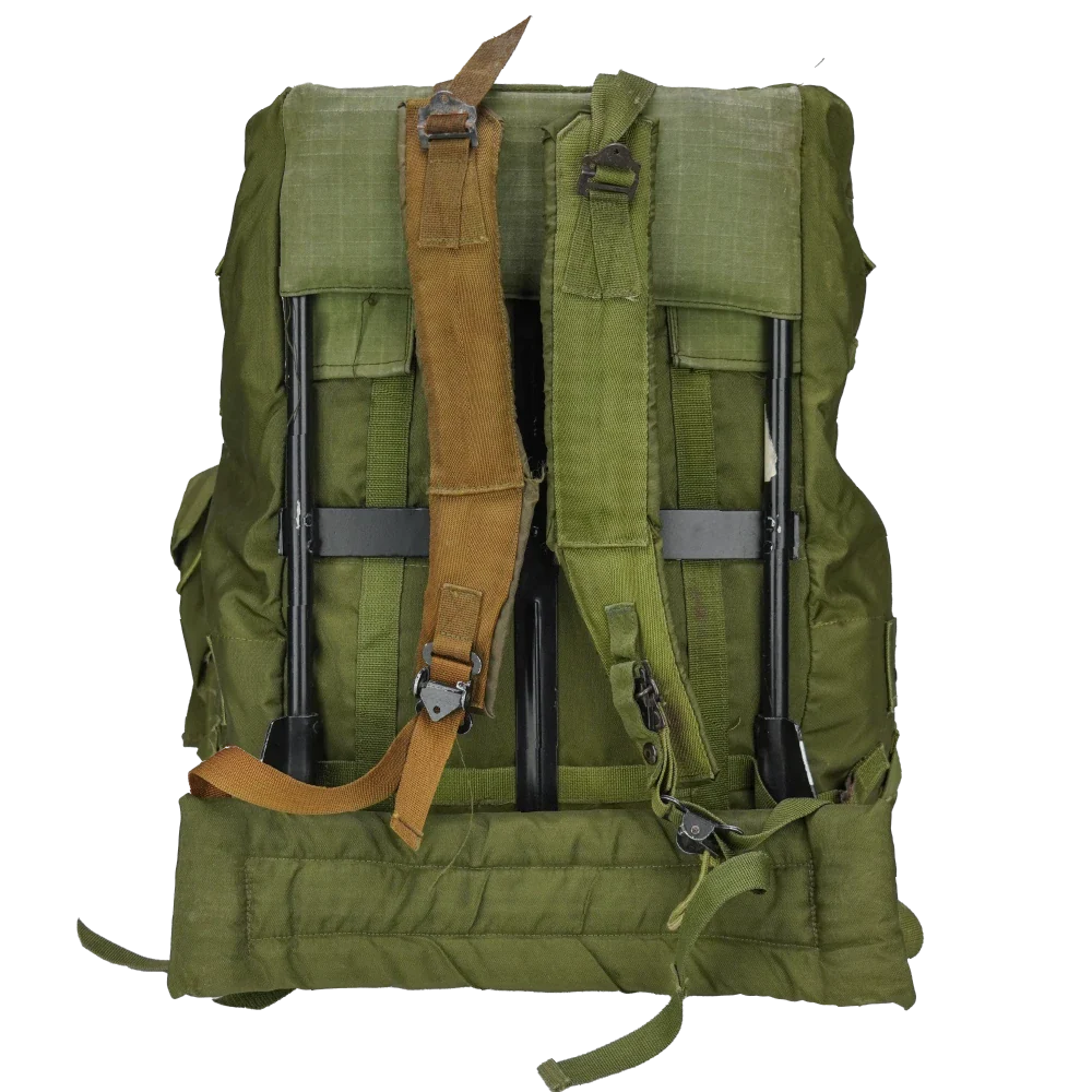 Includes metal frame and webbing straps for securing additional gear. Visible signs of use including surface wear and marks consistent with surplus condition.