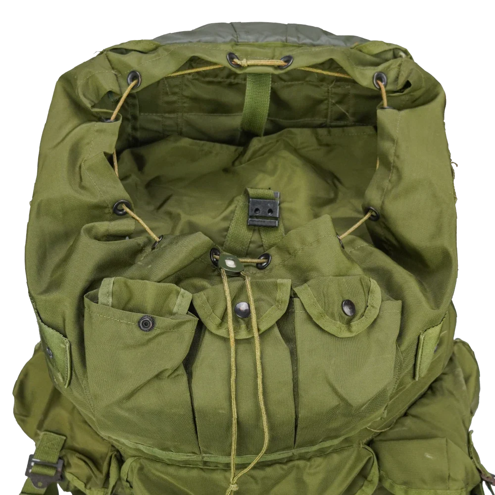 NZ Army ALICE pack with external metal frame in olive drab. Large main compartment with drawstring closure and top flap, supported by multiple external pockets with snap closures. The frame provides structure and spacing from the back, with padded backing and adjustable shoulder straps attached.