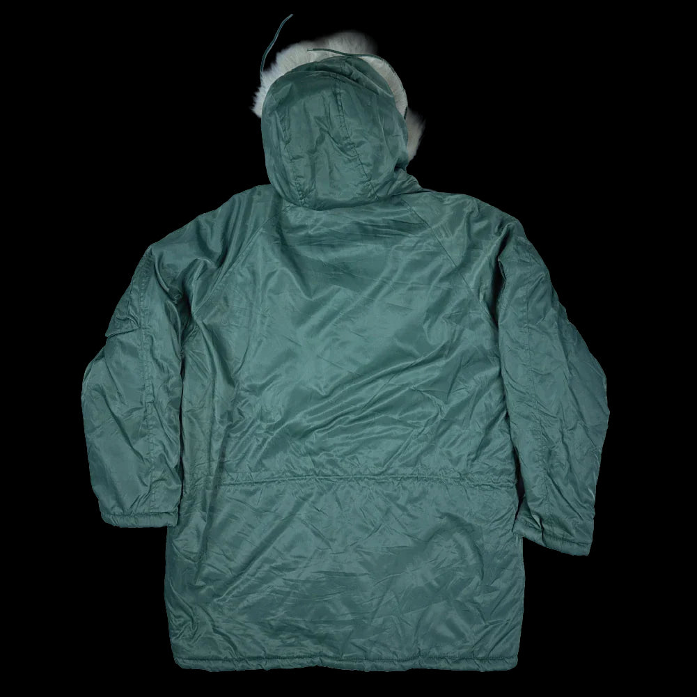 Commercial N-3B style extreme cold weather jacket in olive. Features a synthetic-lined hood with synthetic ruff and lined hip and waist pockets. Manufactured by Fieldmasters in South Korea.