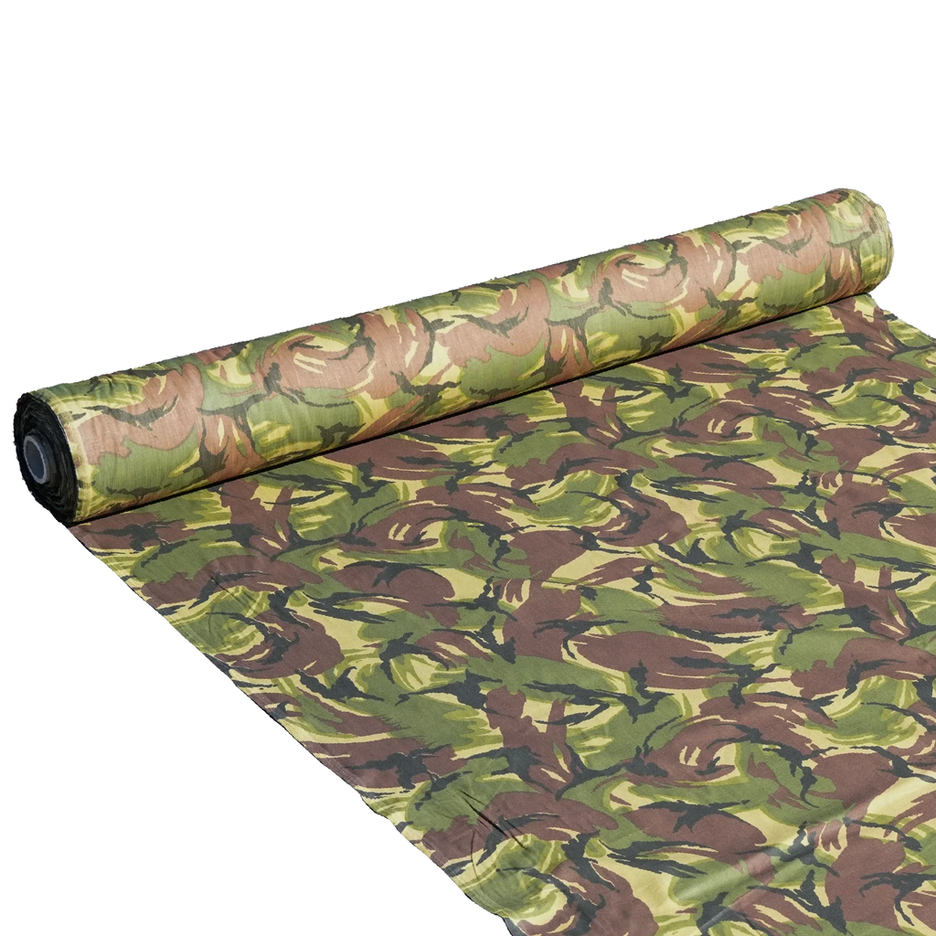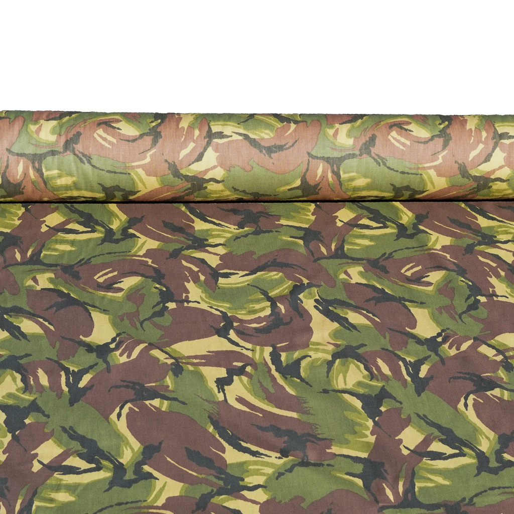 Papua New Guinea DPM camouflage fabric sold per metre. The fabric features a bold DPM pattern with sweeping brown and green shapes layered over a light tan base, with dark brush-stroke accents throughout. It is made from a 75% cotton and 25% polyester blend.