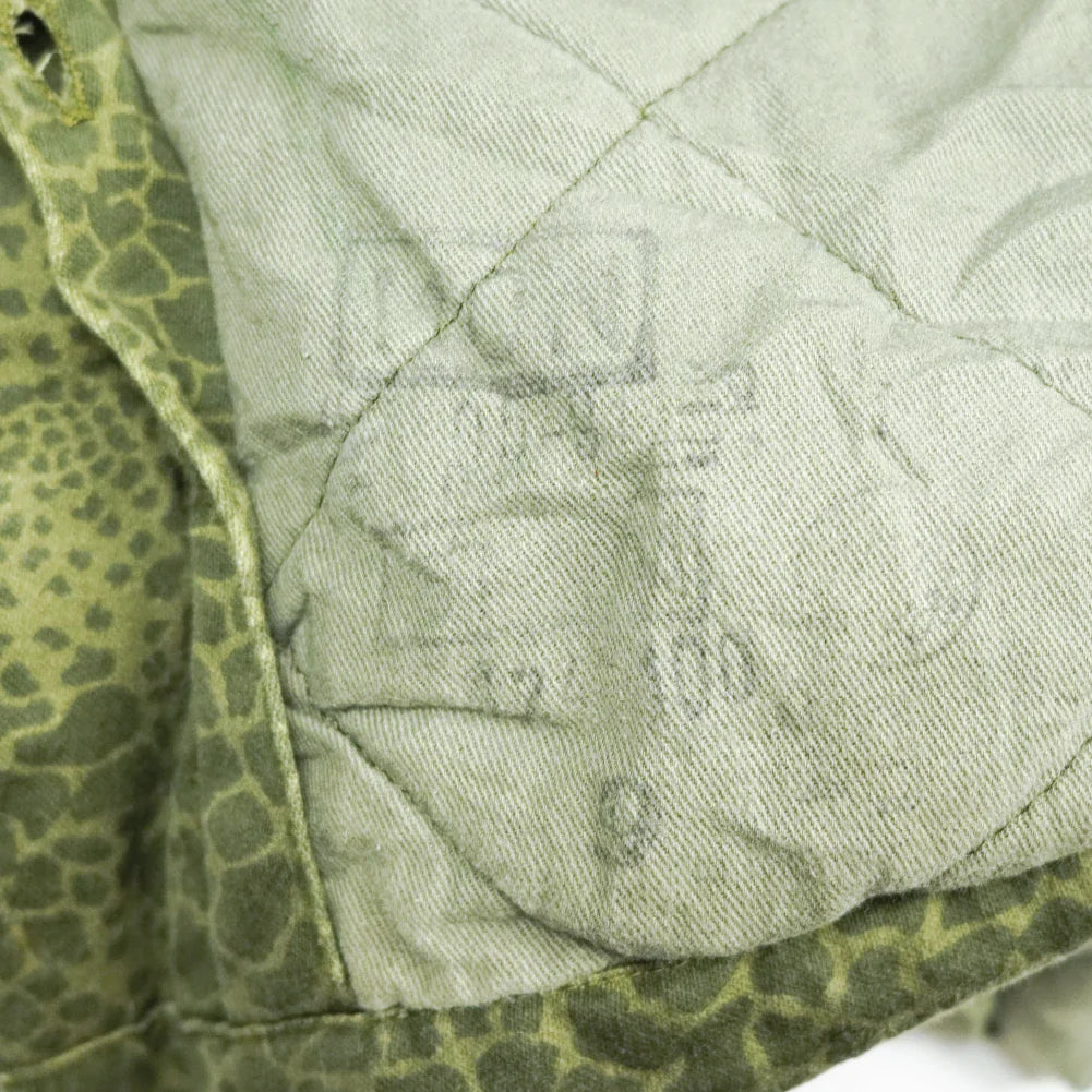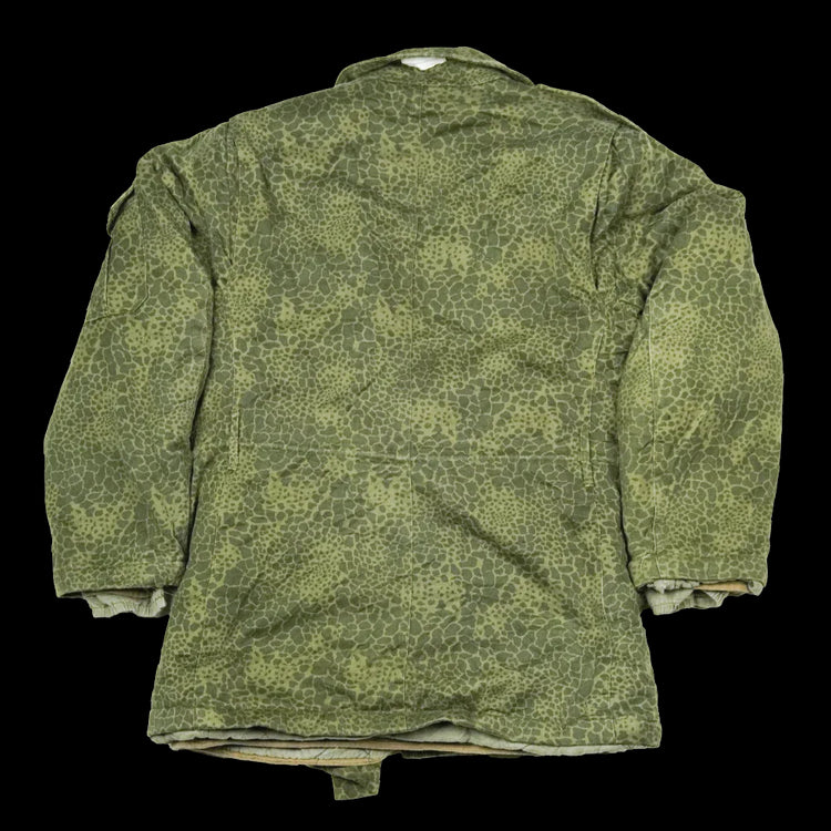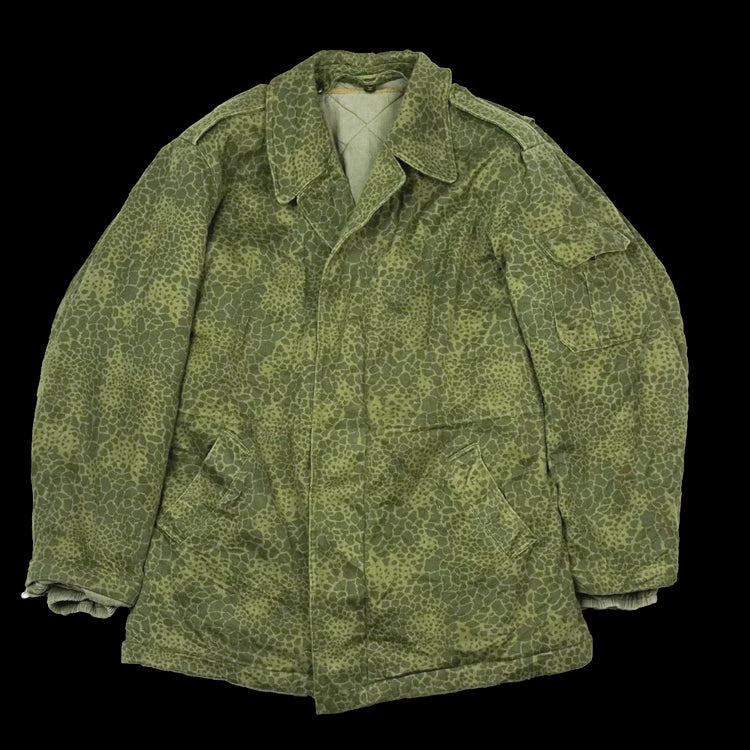Polish Army surplus field jacket in Puma camouflage. Button-in quilted liner and adjustable drawcord waist are present, with multiple pockets for storage.