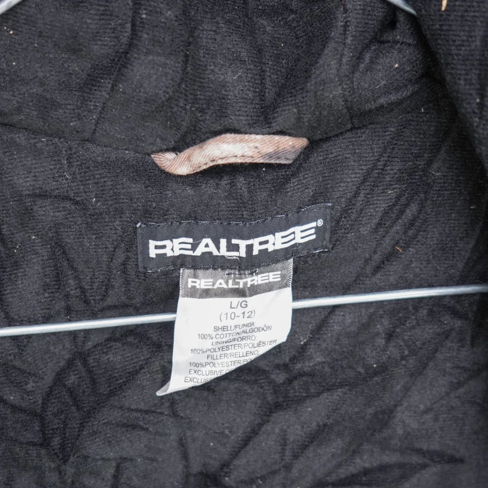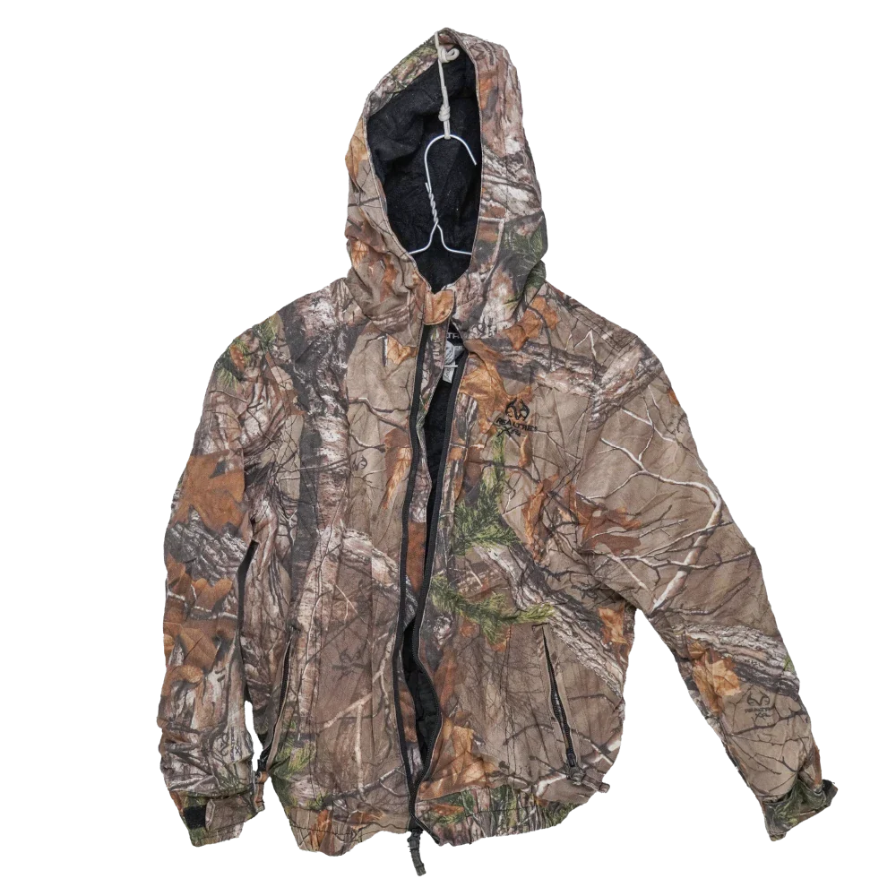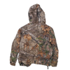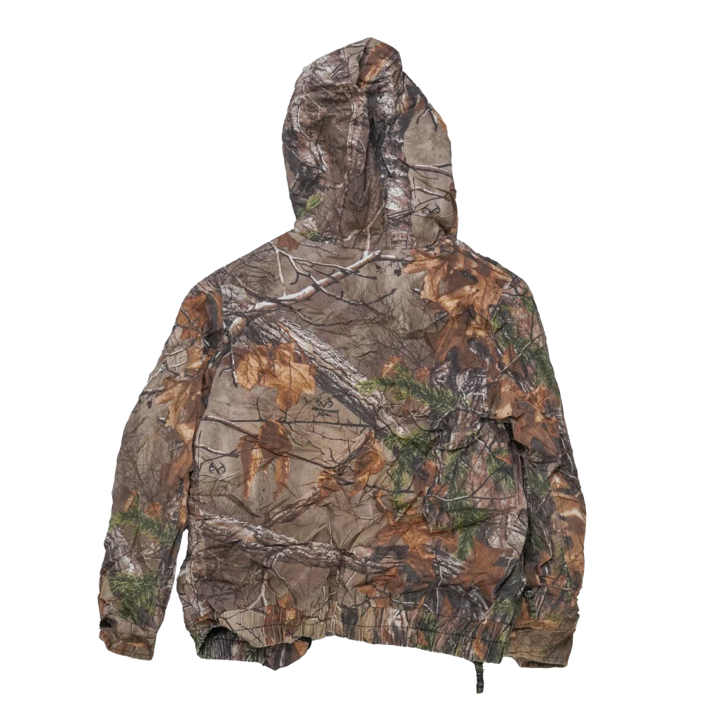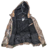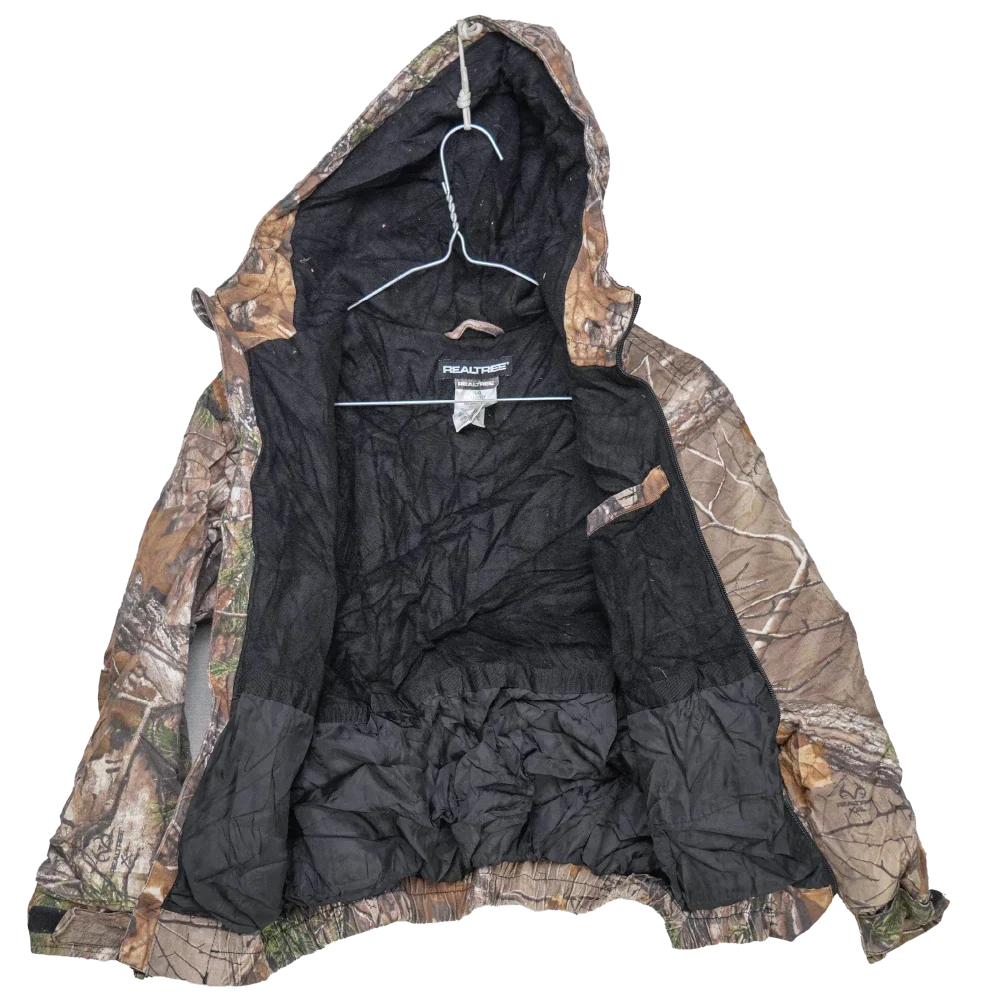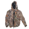 Youth-sized Realtree camouflage jacket with a lined interior and attached hood. The jacket features a camouflage outer pattern and insulated lining for added warmth.