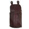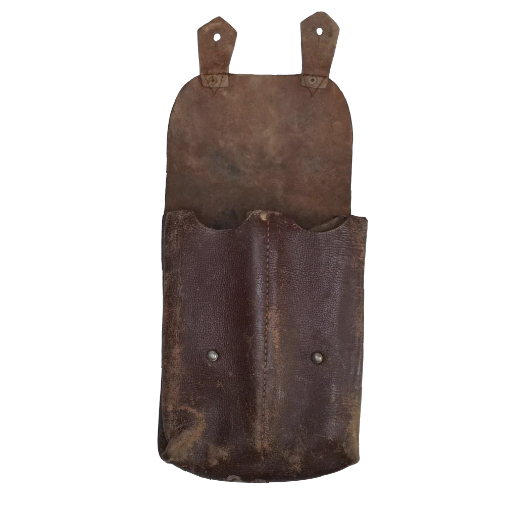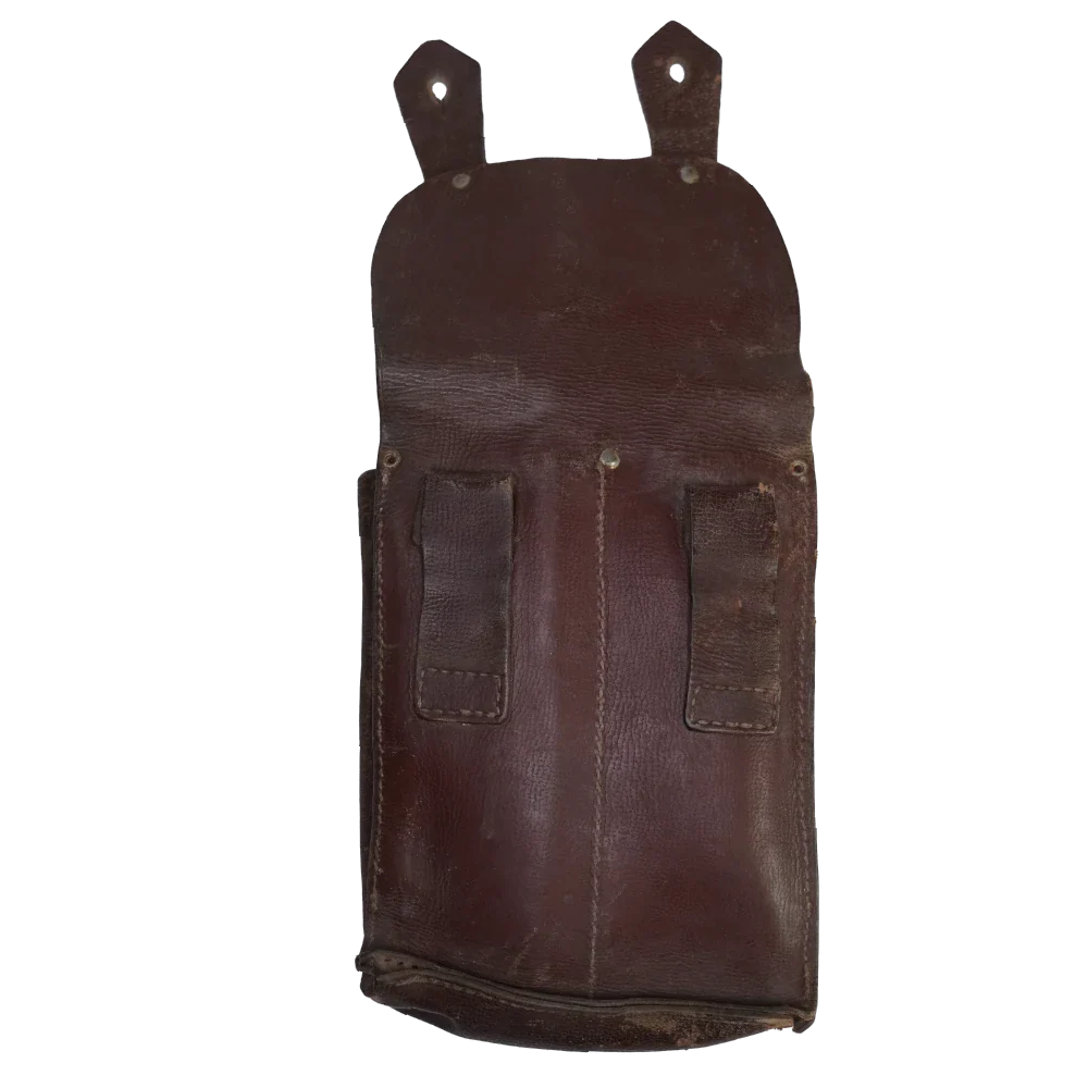 Romanian Army leather magazine pouch. Brown leather construction with a structured body and secure closure flap.