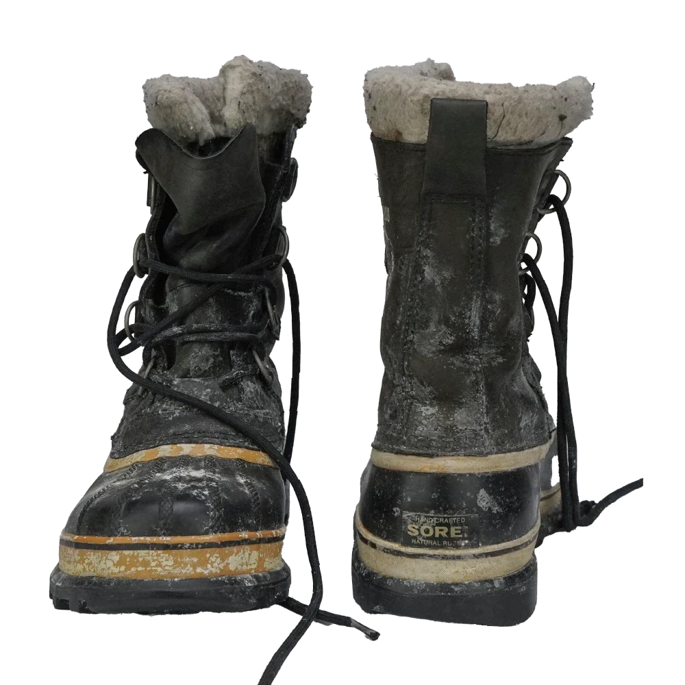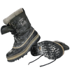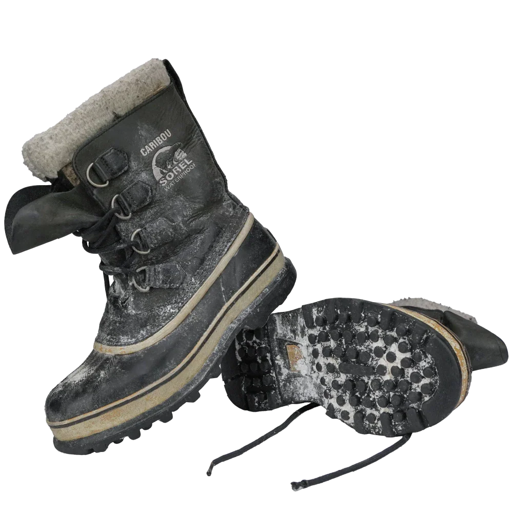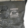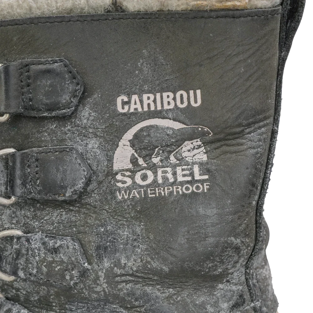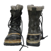 Sorel Caribou women's cold weather boots in black. Leather upper with a rubber lower shell and thick insulated inner lining, featuring a high-cut profile and lace-up front with metal D-ring eyelets. Chunky treaded sole with circular lug pattern for grip.