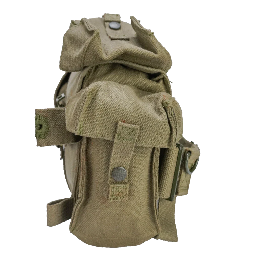 South African Pattern 70 kidney pouch set in khaki cotton canvas. Heavyweight construction with solid metal hardware. Includes belt, four double FAL magazine pouches, and two large kidney pouches.