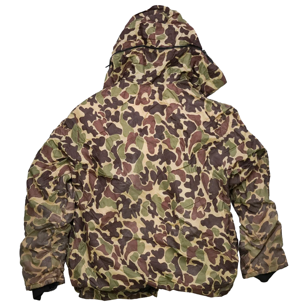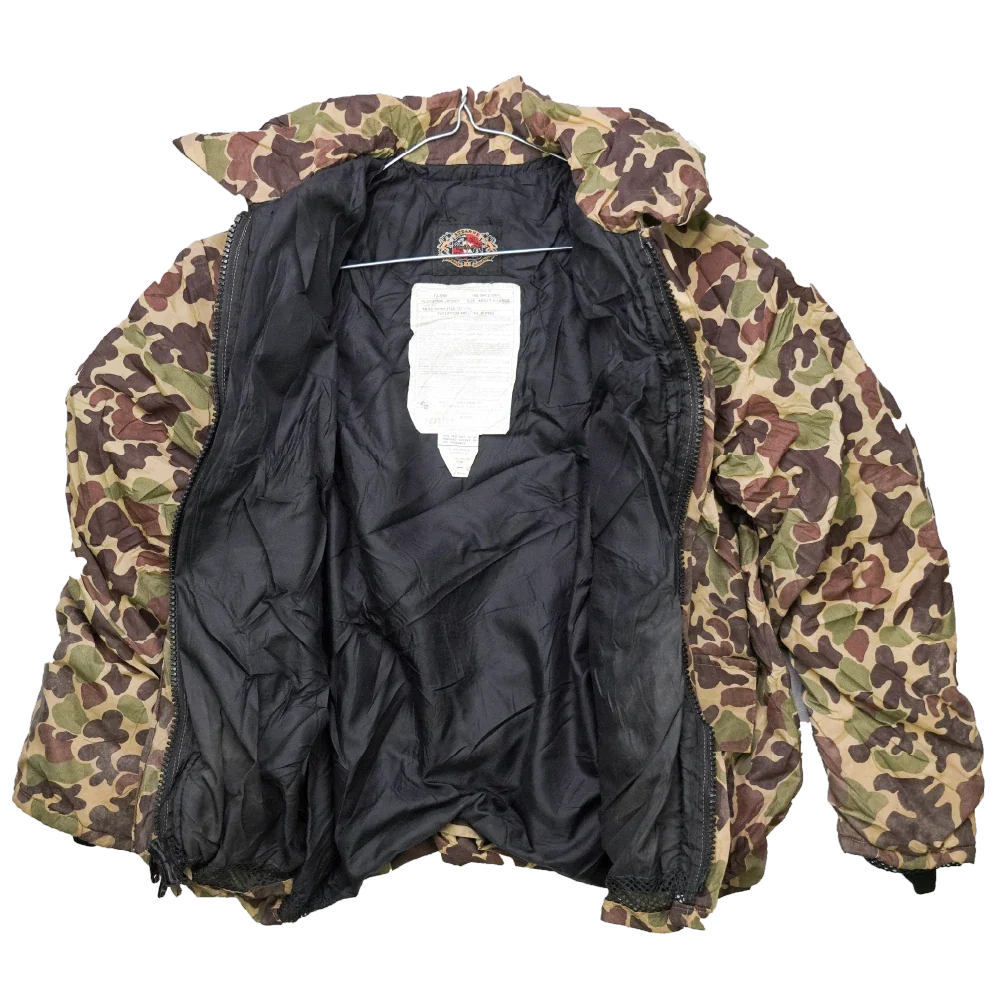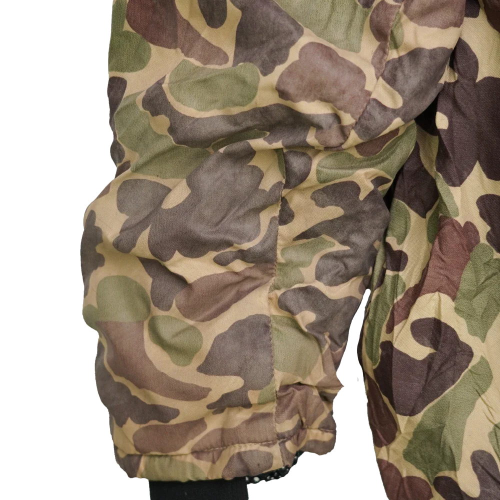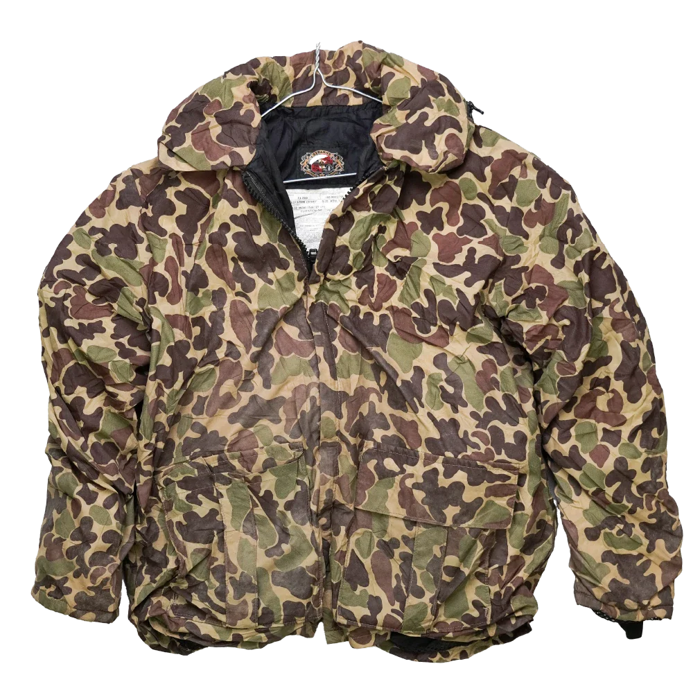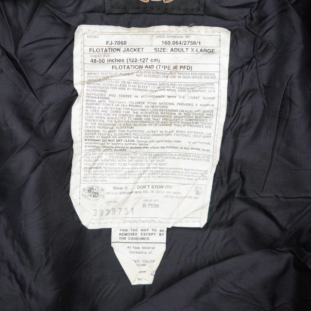 Commercial flotation jacket by Stearns in a camouflage pattern. Padded construction with a front zip closure and integrated flotation panels.
