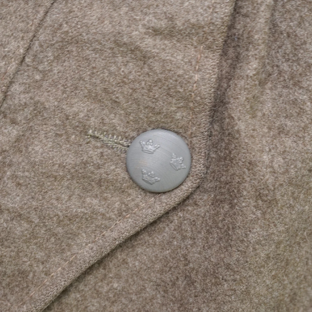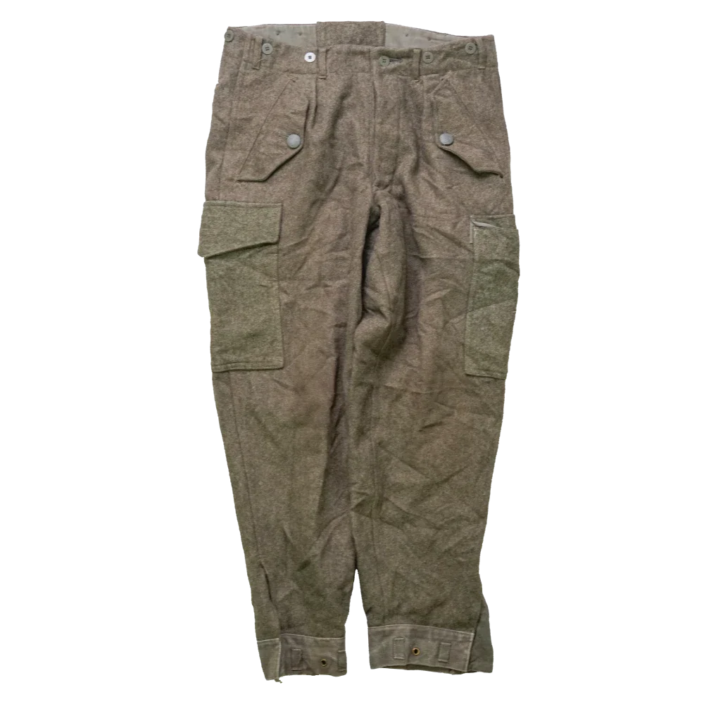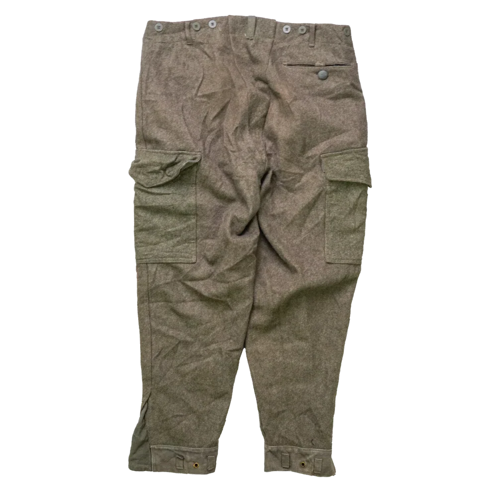 Swedish Army M39/58 wool trousers. Heavy wool construction with a structured military cut and button fly closure. Traditional field design with brace buttons at the waistband.