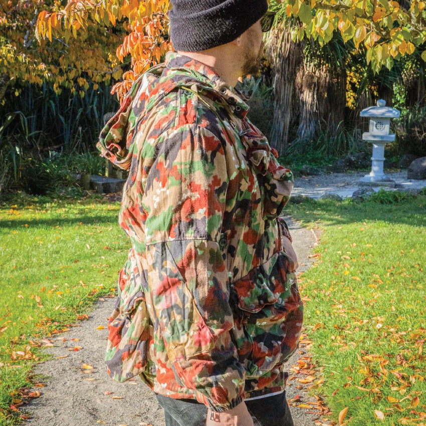 This Swiss army M70 jacket was the pinnacle of quality and versatility for it's time. Issued from 1957 to 1983, this jacket was designed with a huge amount of storage, it's essentially a load bearing system on a jacket! All in iconic TAZ 57 (Alpenflage).