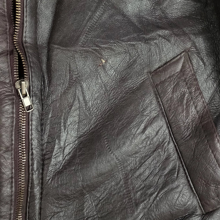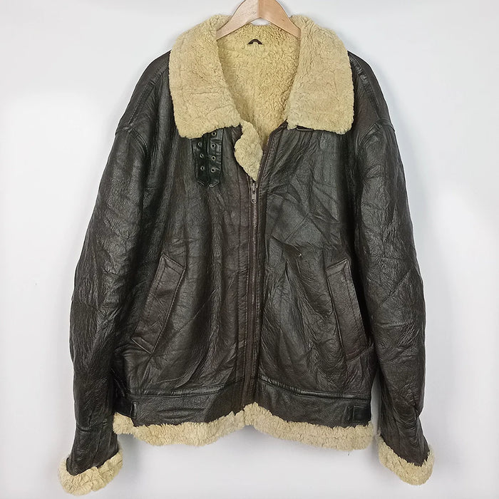 An incredibly supple sheep shearling Type B-3 jacket, made in the USA. Unusually large size (marked 60, a comfortable 2XL) and no manufacturer (e.g. Avirex) to inner tag. The fur is continuous throughout and very warm. Adjustable buckled lower and neck for a snug fit. The B- type jackets were the first to keep high altitude pilots warm.