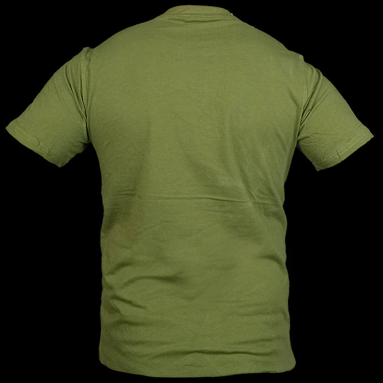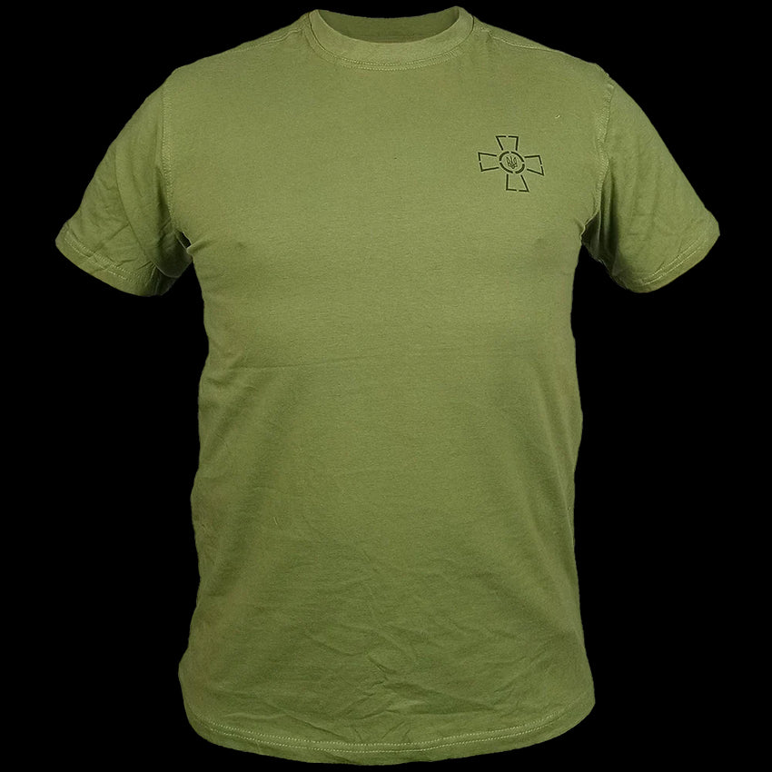 Ukrainian Army green short-sleeve T-shirt featuring the national emblem proudly displayed on the chest. Made from durable cotton blend for comfort and breathability, it’s designed for both field and casual wear. A practical piece symbolizing service, resilience, and patriotism, commonly issued to Ukrainian armed forces personnel.