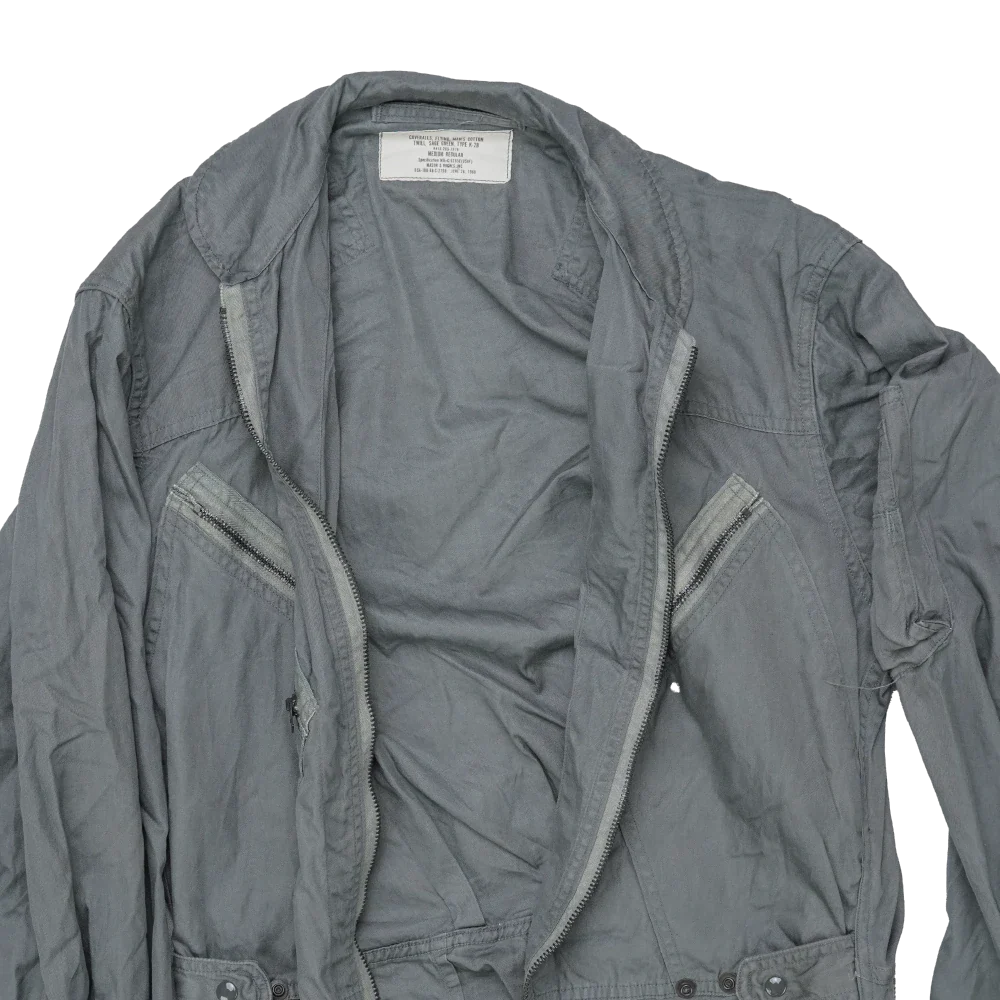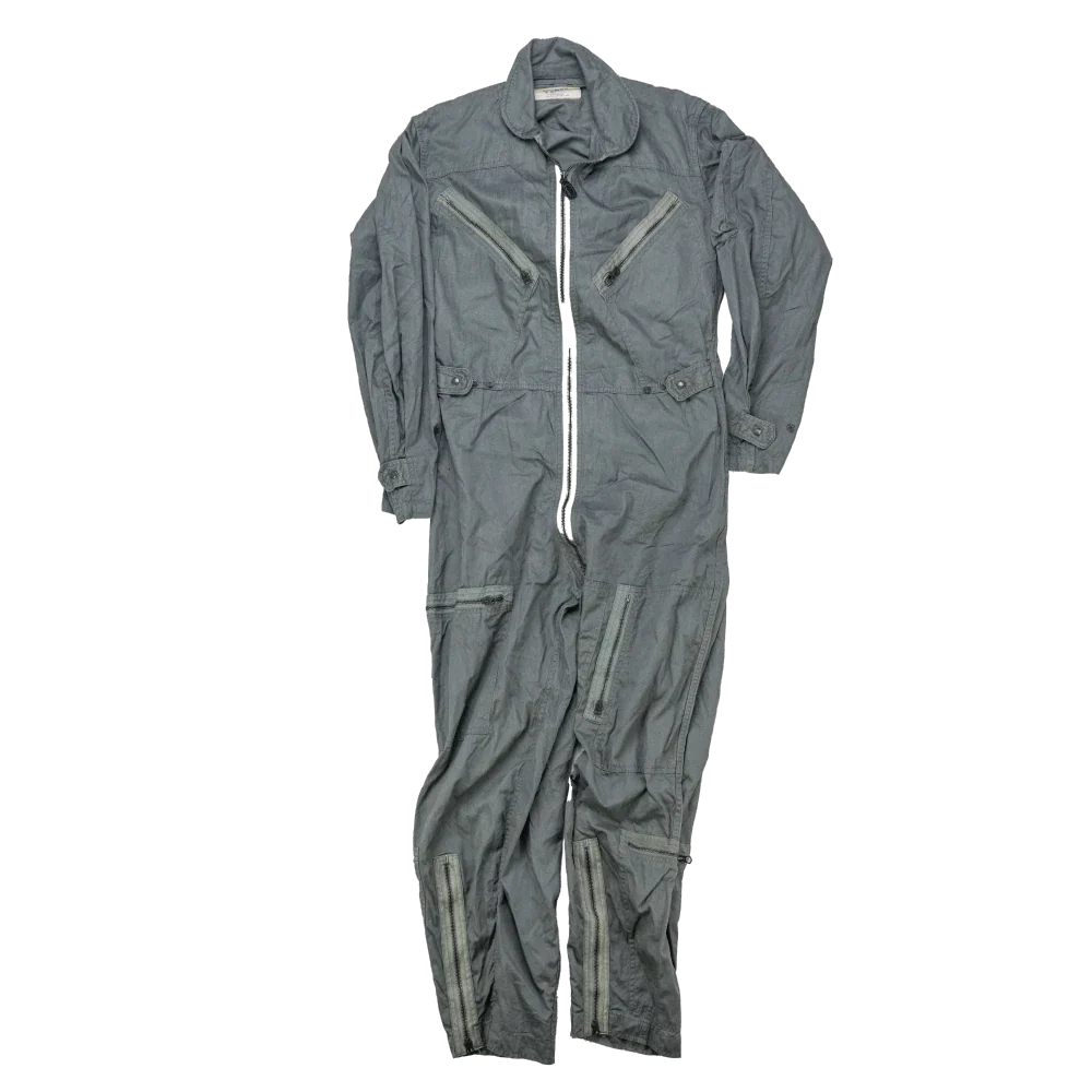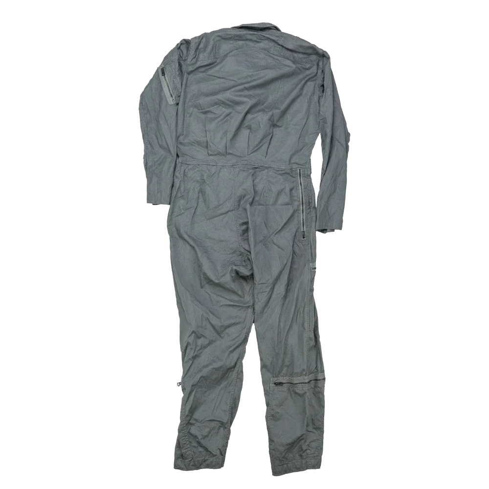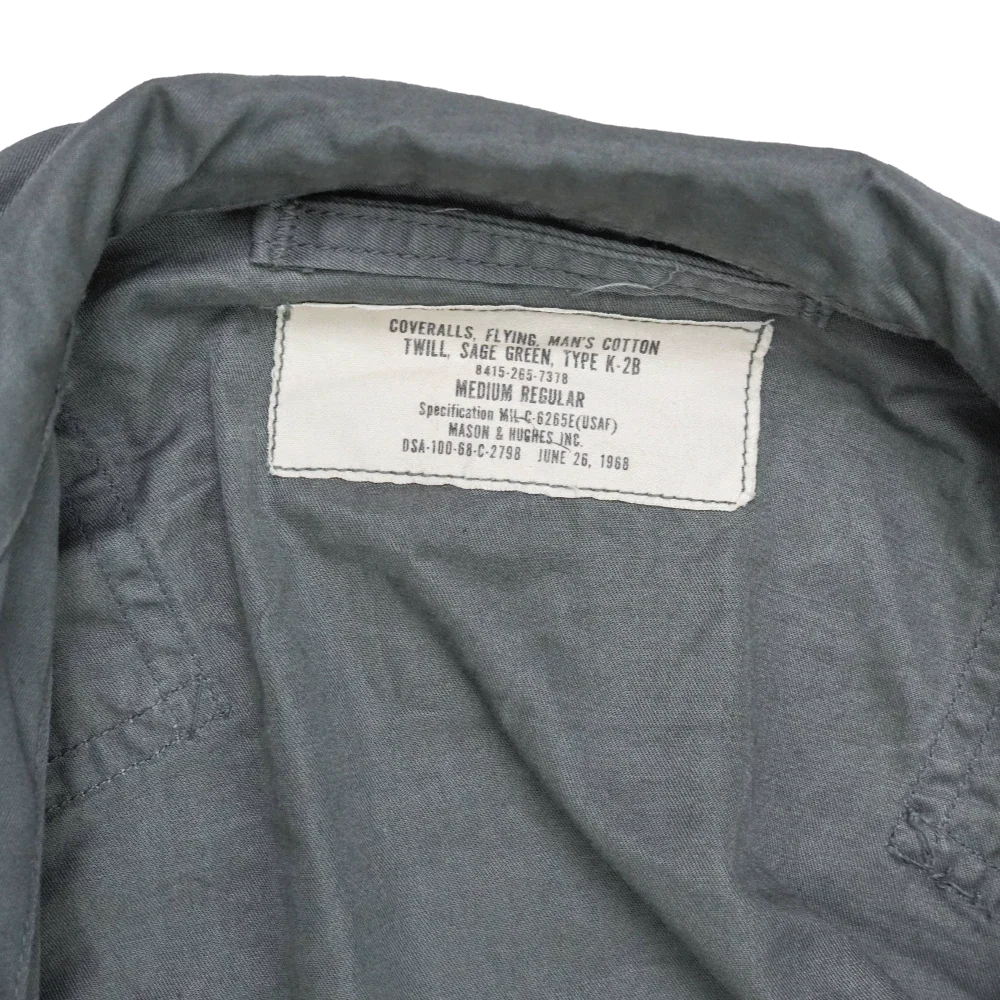 US Air Force K-2B flying coveralls in Medium Regular sizing. One-piece flight suit with full body construction and integrated waist adjustment. Manufactured in 1968.