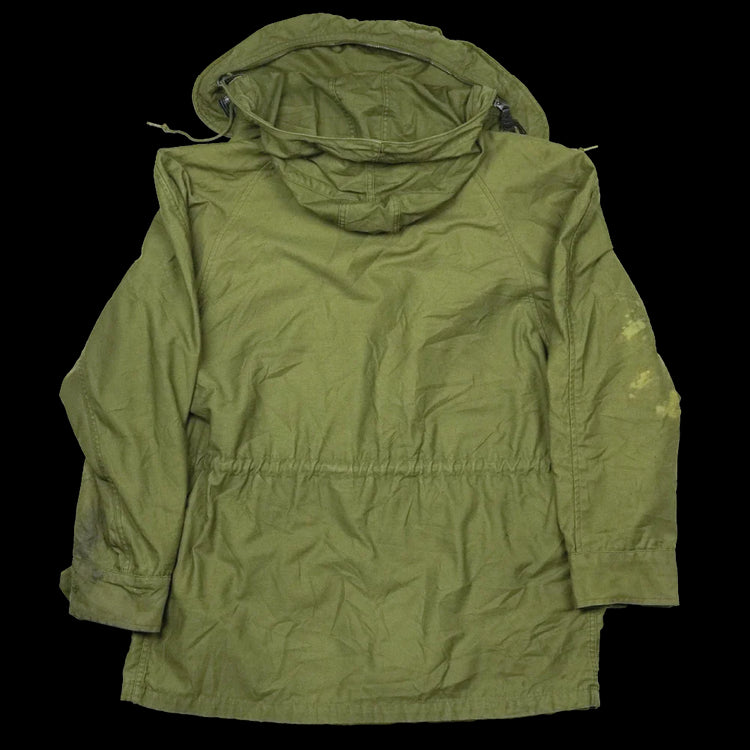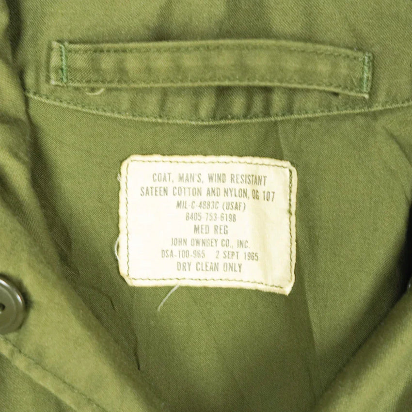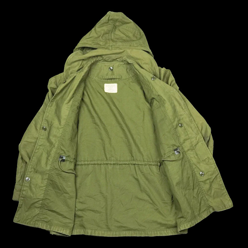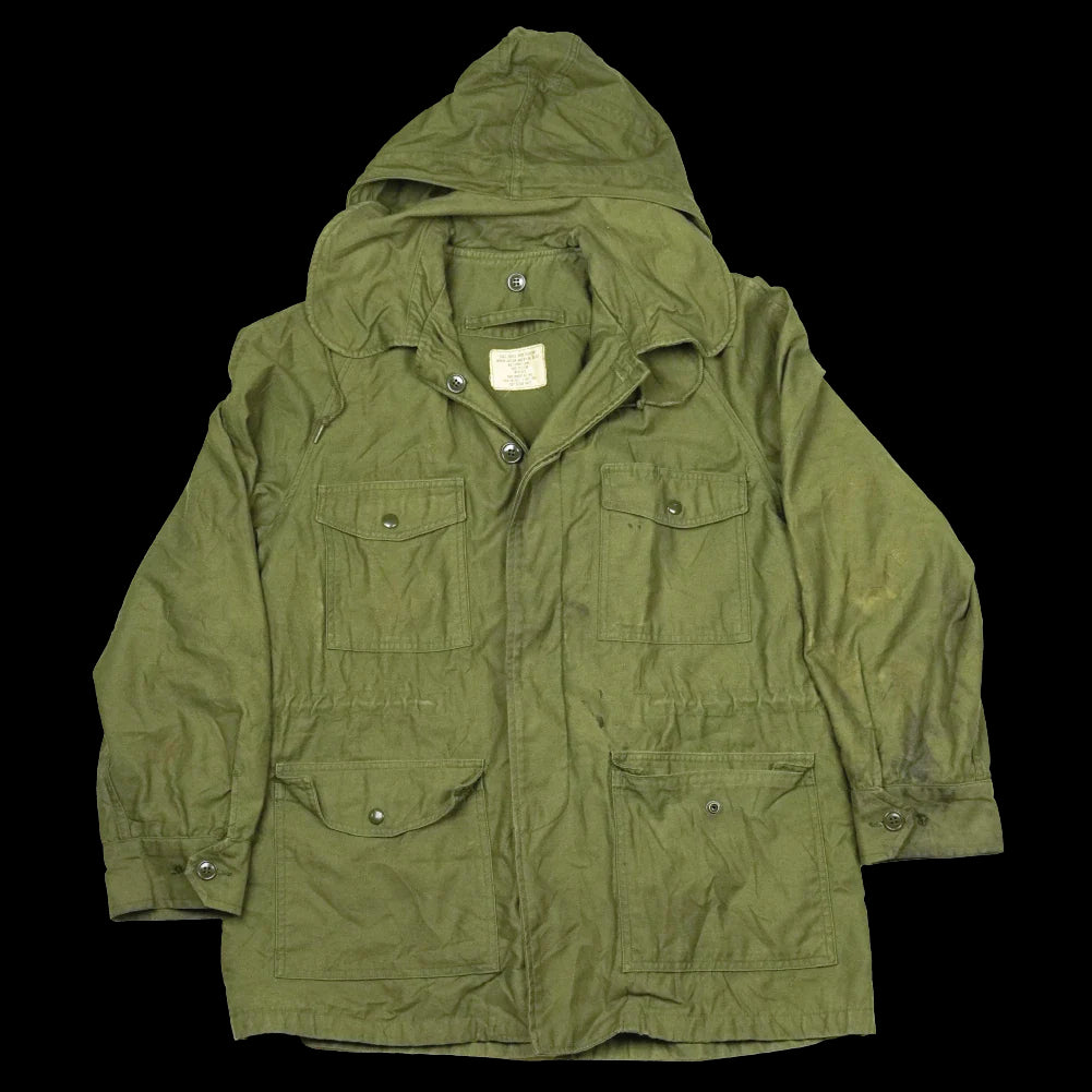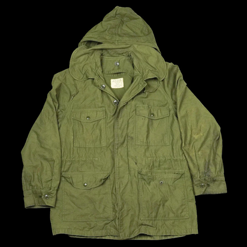 US Air Force wind resistant sateen jacket manufactured in 1965. The design sits between earlier and later US field jackets, with a front button closure and a stowable hood housed in a large collar.